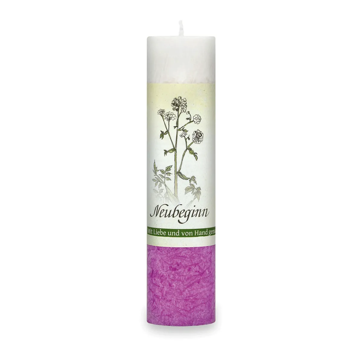 Oft stehen wir im Leben an Wegkreuzungen und es braucht Mut, Willensstärke, Selbstbestimmtheit und Erkenntnis, um den richtigen – vielleicht nicht einfachen – neuen Weg zu gehen. Jede bewusste Lebensveränderung gibt uns die Chance zu reifen und Mitschöpfer für ein erfülltes Leben zu werden. Die enthaltenen Pflanzen begleiten uns beim Erkennen des Weges, den es zu meistern gilt: Beifuß, Birke, Salbei, Dammar, Holunderblüten, Schneeglöckchen, Lemongras. Pink steht für Ordnung, Optimismus und Engagement, Weiß für Klarheit und Reinheit, dies sind hilfreiche Eigenschaften für den Neubeginn. Eine kleine Manufaktur in den Allgäuer Alpen stellt die von Hand gegossenen Kostbarkeiten her, die so schön gleichmäßig abbrennen. Grundlage bilden 100% pflanzliche Stearine aus Resten der europäischen Olivenölproduktion. Hinzugefügt werden Pflanzen oder Harzauszüge, Heilkräuteressenzen, naturreine Öle und Tinkturen aus biologischem Anbau oder Wildsammlung. Neben dieser feinen Mischung begeistert die Kerze auch durch ihr Farbspektrum: von Weiß, das der Lehre nach für Klarheit und Reinheit steht, bis Pink, das Ordnung, Optimismus und Engagement symbolisiert.