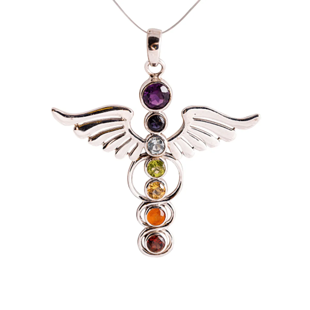 Der Stab des Hermes ist ein uraltes Symbol für Ganzheit und Harmonie. Der Stab symbolisiert die Verbindung zwischen Erde und Himmel, die beiden Schlangen stehen für die Harmonie in unserer dualen Welt. Die Flügel der Schlangen repräsentieren die Freiheit und die Fähigkeit, sich über die Grenzen der irdischen Welt zu erheben. Der Stab des Hermes ist ein Symbol für unsere spirituelle Heilung, die Ganzheit unseres Seins und zeigt uns, welche unglaublichen Möglichkeiten wir haben, wenn wir sie erkennen. Der Mensch selbst ist der Mittler zwischen Erde und Himmel, hier wunderschön dargestellt über die leuchtenden Chakras. Silber 925 mit Granat, Carneol, Citrine, Peridot, blauer Topaz, Iolith, Amethyst, L. ca. 5,4 x B. ca. 4,6 cm.