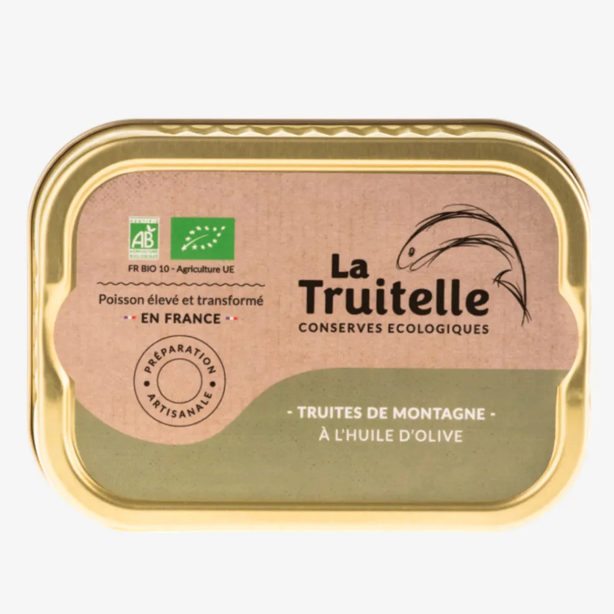 Die Regenbogenforellen von La Truitelle werden in kristallklarem Wasser von Bergquellen und Gebirgsbächen aufgezogen. So entwickeln die ökologisch gezüchteten Forellen eine Textur wie sie eher Wildfische haben. Fangfrisch werden die handverlesenen Fische behutsam mit Dampf vorgegart und anschließend in nativem Olivenöl extra appertiert – wobei ihr milder besonderer Geschmack hervorgehoben und noch verfeinert wird. In den Konserven sind zwei bis vier kleine Forellen enthalten. (bio-zert. DE-ÖKO-006)