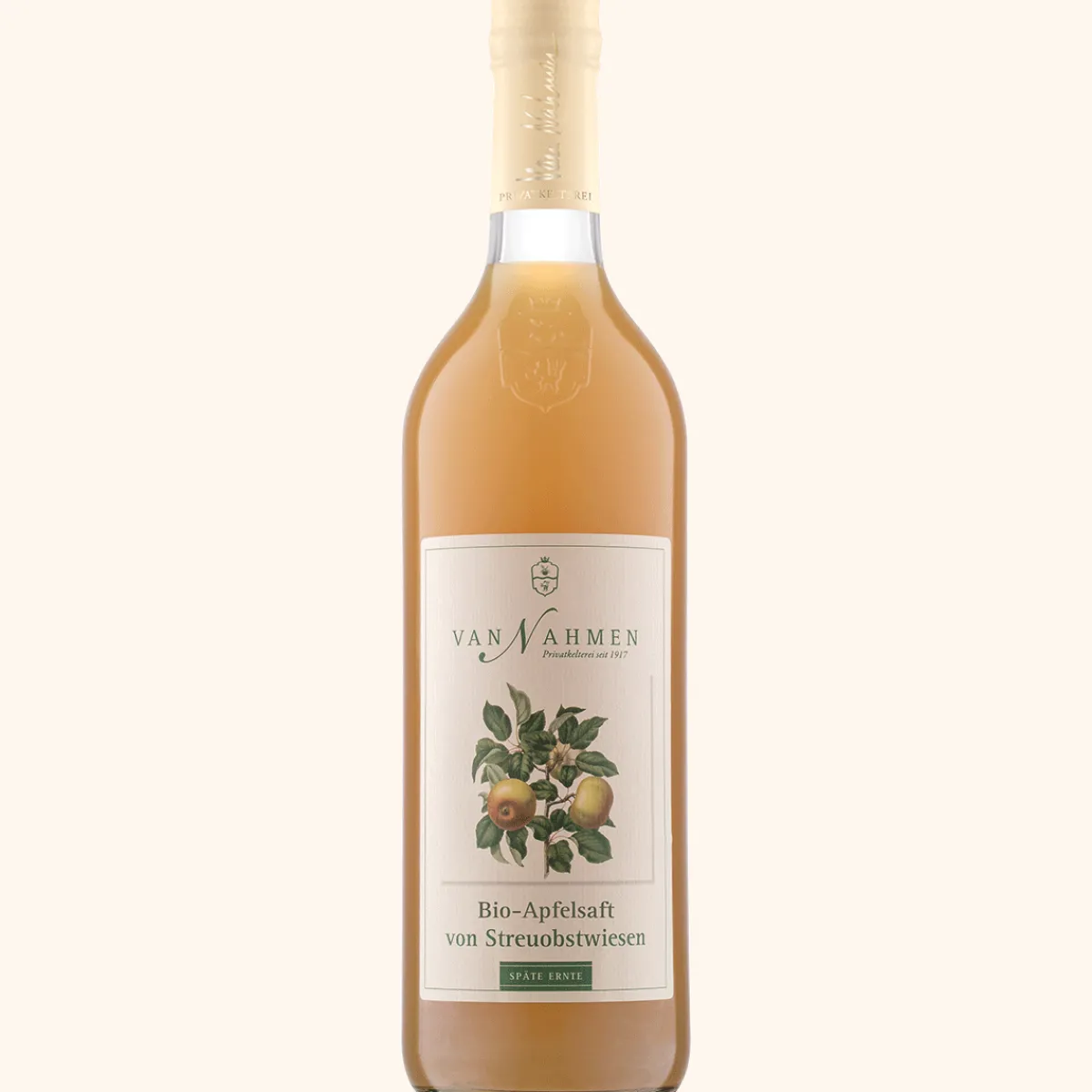 Zum intensiven Geschmack und Aroma dieses feinen Bio-Apfelsaftes tragen ausschließlich spät geerntete Äpfel von bis zu 80 Jahre alten Bäumen bei. Der Bio-Apfelsaft von traditionellen Streuobstwiesen ist eine Kombination aus dezenter Süße und saftig-frischer Säure. Er passt gut als Begleiter zu scharf gewürzter asiatischer Küche, zu Huhn, Pute, Krustentieren und Meeresfrüchten. Seit 1994 engagiert sich die niederrheinische Traditionskelterei Van Nahmen – gemeinsam mit dem Naturschutzbund (NABU) – für die Erhaltung von Streuobstwiesen. Um die Wiesen zu schützen, erhalten Vertragslandwirte höhere Preise für ihre Ernte, sodass sich die Kultivierung für sie lohnt. Mit dem Kauf einer Flasche des Bio-Apfelsafts können sie aktiv zum Schutz der heimischen Umwelt beitragen (Bio-Zert.-Nr. DE-ÖKO-007).
