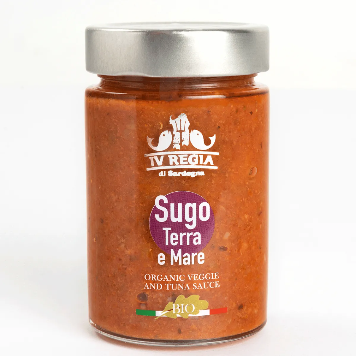 Der traditionell puristische »Sugo Terra e Mare« von »IV Regia di Sardegna« kombiniert die besten Zutaten von Land und Meer: sonnengereifte Tomaten, Auberginen, Zucchini und Karotten treffen auf frischen Thunfisch und mediterrane Kräuter. Alle Zutaten sind in bester Bio-Qualität und werden direkt vor Ort auf Sardinien verarbeitet. Die würzige Bio-Tomatensauce mit Thunfisch passt hervorragend zur sardischen Pasta Fregola oder zu Maccheroni, Fusilli und Penne sowie zu Fisch- und Fleischgerichten mit Kartoffelecken aus dem Ofen.