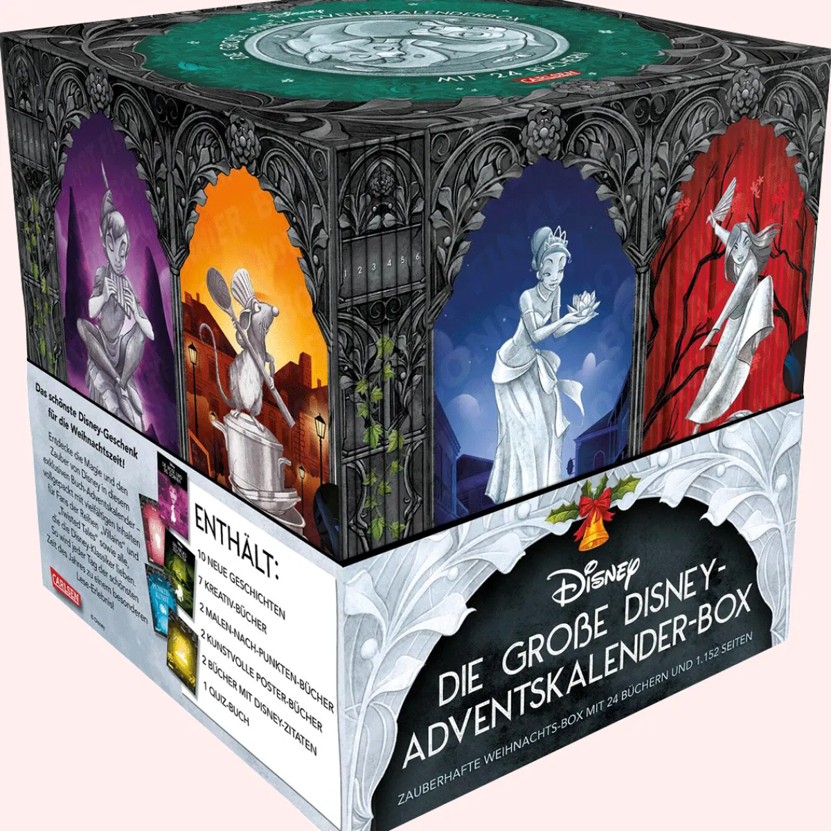 Diese sehr dekorative Adventskalender-Bücher-Box von Disney wird 2025 der Nachfolger des Platz-1-Lieblingskalenders aus 2023 für die Fans der »Disney Villains« und »Twisted Tales«. In der Box befinden sich für die Adventszeit 24 kleine Taschenbücher mit je 48 Seiten. Eine gelungene Mischung aus neuen, exklusiven Disney-Geschichten, stylischen Quizbüchern, Colouring-Büchern und vielen weiteren. (Ab 10 Jahre)