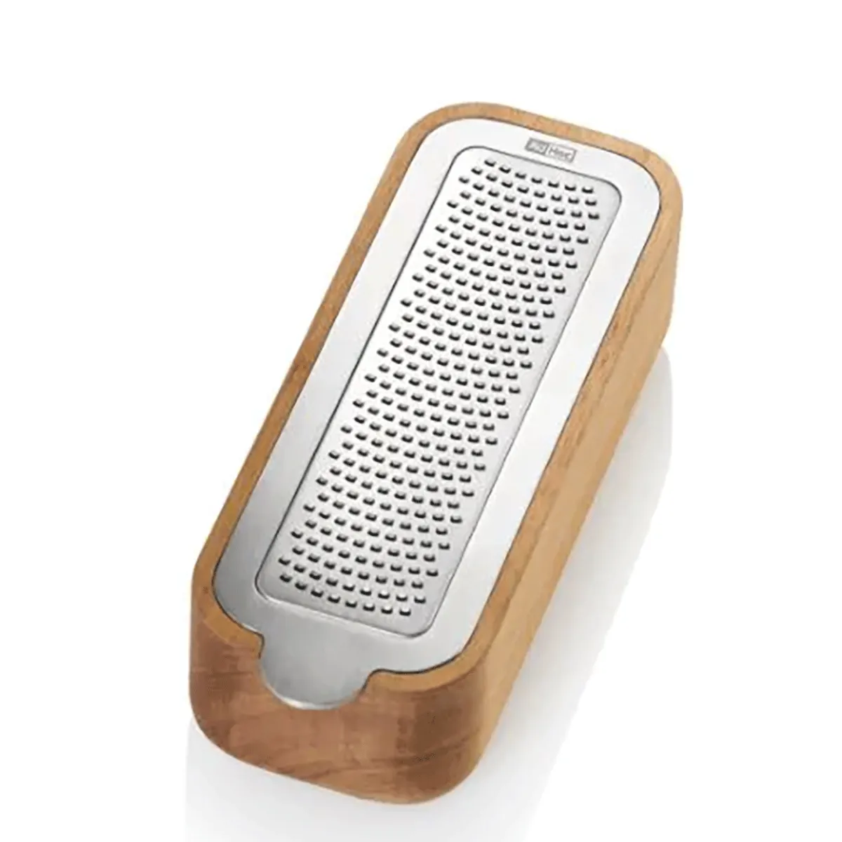 Die Feinreibe mit ihrer Materialkombination aus Edelstahl und Akazienholz ist nicht nur funktional, sondern auch ansehnlich. Dank der präzisen, fotogeätzten Klingen im curved Design lassen sich Lebensmittel wie Hartkäse, Gewürze, Nüsse oder Schokolade wunderbar zerkleinern – die große Reibefläche bietet ausreichend Platz. Der darunterliegende Behälter aus fein gemasertem Akazienholz fängt das Mahlgut auf und dient gleichzeitig als Aufbewahrung und Serviergefäß. Passt perfekt zum Dinner auf den Tisch – optisch und inhaltlich. Die Reibe steht auf Gummifüßen; die oben aufliegende Reibeklinge lässt sich leicht abnehmen und ist spülmaschinenfest. Das Holz bitte nur per Hand reinigen.