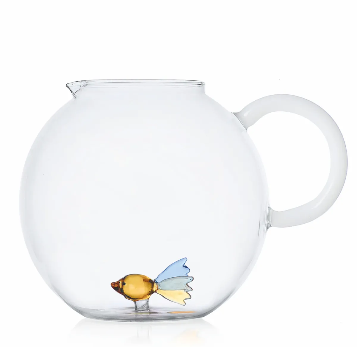 Ist das nicht eine originelle bauchige Glaskanne mit dem kleinen gelben Fischlein, das darin zu schwimmen scheint? Das edle und amüsante Glasgefäß für gut zwei Liter Saft oder Wasser haben wir in Mailand entdeckt. Der Entwurf für die Glaskollektion »Animal Farm« stammt von der jungen Designerin Alessandra Baldereschi. Sie absolvierte ein Industriedesign-Studium und entwirft seitdem Beleuchtung, Möbel, Accessoires und eben so ungewöhnliches Geschirr wie die Glaskanne »Fisch«. Baldereschi hat ihre Entwürfe bereits bei so namhaften Ausstellungen wie der »Triennale di Milano«, der »Biennale di Saint Etienne«, der »Inside Design Amsterdam«, dem » Seoul Design Festival« und in der »Moss Gallery, New York« präsentiert. Diese Glasserie mit Krügen und Gläsern hat die Designerin für das Glasbläserunternehmen »Ichendorf Milano« entworfen, das im frühen 20. Jahrhundert in der Nähe von Köln gegründet wurde, aber seit 1990 in Mailand ansässig ist. Denn Mailand hat sich zum kreativen Zentrum für Künstler, Handwerker und Designer entwickelt. Die Glasbläser verbinden auch bei dieser Kollektion alte Traditionen mit innovativen Ideen. Wir sind begeistert! Schauen Sie sich gerne jetzt noch die dazu passenden Gläser und weiteres Glas aus Mailand an, das Ihrem gedeckten Tisch eine ganz besondere Note verleihen wird!