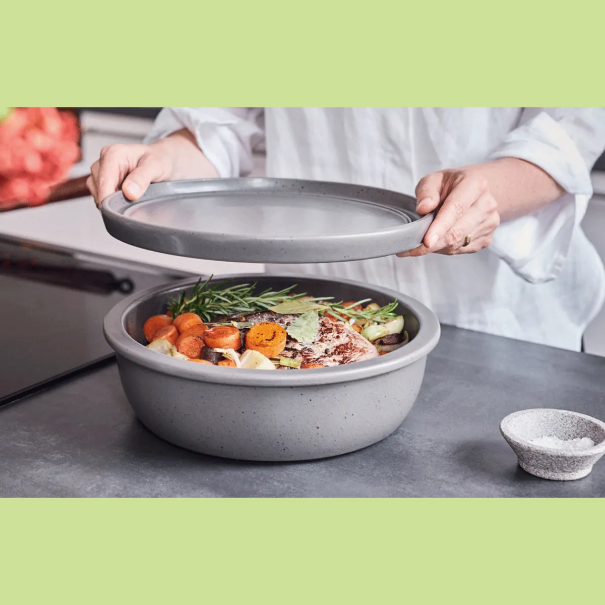 Vom Feuer auf den Tisch: Der schöne Keltentopf von Denk ist Bräter und Servierschale zugleich. Er überzeugt mit besten Kocheigenschaften und ist ein stilvoller Hingucker für jeden Tisch. Zum Kochen und Braten auf offenem Feuer, Kohlegrill oder im Ofen ist er, dank der patentierten feuerfesten, wärmespeichernden Keramik, wunderbar geeignet. Durch die spezielle Glasur benötigen Sie nicht mal Fett zum Anbraten – eine Tatsache, die Gesundheit und ein perfektes Röstaroma fördert. Die Schale kann direkt auf eine Flamme gestellt werden. Mit der im Set enthaltenen Platte, kann zusätzlich gekocht und gegrillt werden; vor allem aber hält sie das zubereitete Gericht im Keltentopf geschützt und sehr lang heiß. Und anders als bei vielen Metalltöpfen ist auch ein unverfälschter Geschmack der Zutaten, ohne Oxidation, garantiert. Der Topf kann in der Spülmaschine oder von Hand mit Bürste und Spülmittel gereinigt werden. Für hartnäckige Krusten verwenden Sie einfach Natron- oder Backpulver. Schmauchspuren und Bratrückstände können sich je nach Intensität und Benutzungsdauer auf der Keramik einbrennen und gehören als Spuren einmaliger Kocherlebnisse einfach zum Topf dazu. Handgefertigt in der Keramik-Manufaktur Denk, seit 1964.