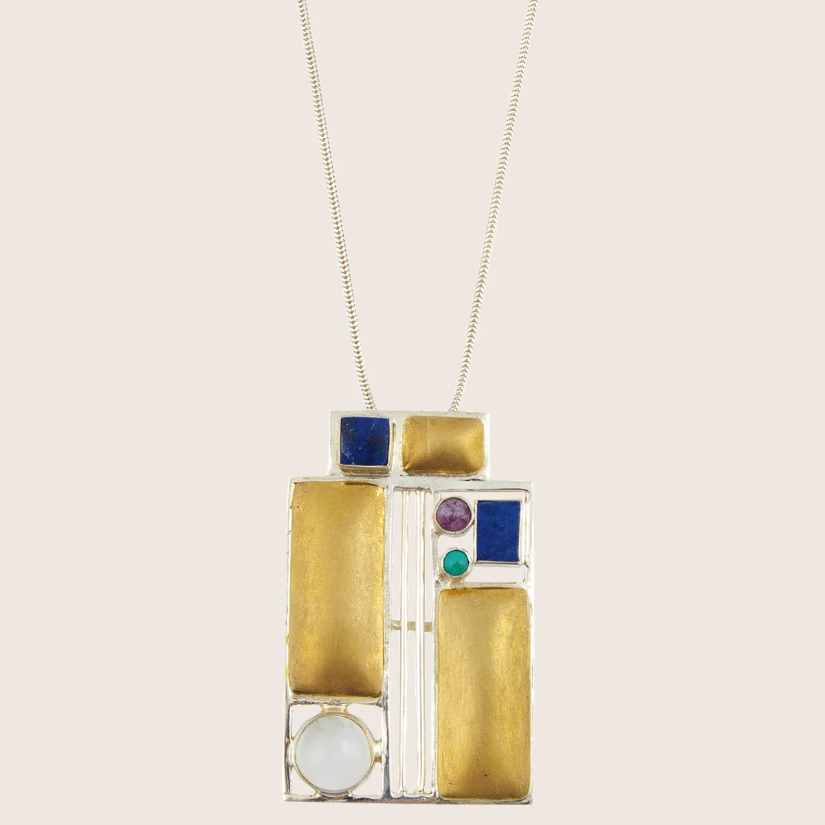 Dieser ausgefallene Kettenanhänger feiert grandios die strukturierte Formensprache des Wiener Architekten und Secessionskünstlers Josef Hoffmann. Er besticht vor allem durch die harmonische Verbindung geometrischer Elemente. Highlights sind die matt schimmernden vergoldeten Flächen und der Besatz mit Schmucksteinen wie kräftig-blauem Lapislazuli, zartem Mondstein, Türkis und Cordierit. Die britische Schmuckdesignerin Paula Bolton entstammt einer Familie von Kaufleuten, die seit dem 17. Jahrhundert vor allem den Fernen Osten bereisten. Sie selbst verbindet in ihren Entwürfen ihre Leidenschaften für Kunst und Geschichte miteinander; die daraus resultierenden Schmuckstücke werden in Handarbeit auf Bali gefertigt, von Handwerkern, deren Fertigkeiten über Generationen weitergegeben werden. Jedes Stück wird so zum Unikat, das durch die verwendeten Schmucksteine zusätzlich veredelt wird.