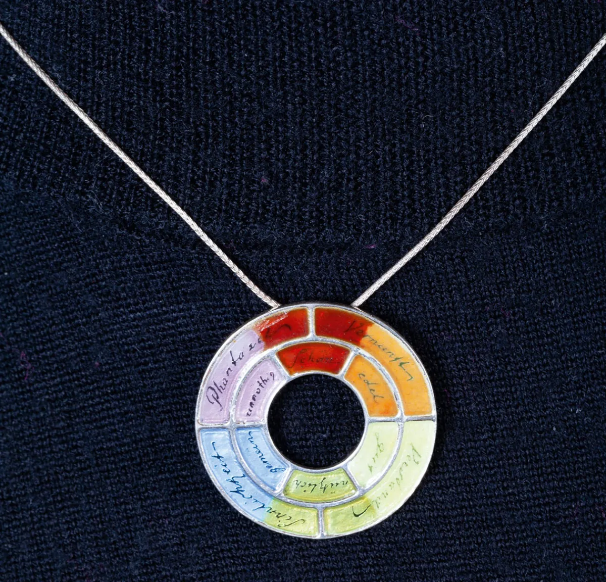 Mit dieser Kette nach Goethes Farbenkreis haben Sie ein absolut besonderes und einzigartiges Schmuckstück bei uns entdeckt! An der Kette aus 925er Sterlingsilber sehen Sie nämlich einen farbigen, kreisrunden Anhänger, der von Hand mit Feueremaille gearbeitet wurde und zwar von dem Schmuckdesigner Christian Guthmann aus Pforzheim. Inspiriert von Johann Wolfgang von Goethes Farbenkreis hat der versierte Handwerker Guthmann dieses Schmuckstück entworfen und eigenhändig hergestellt. Es handelt sich somit bei jeder Kette nach Goethes Farbenkreis um ein Unikat und zwar um ein sehr aufwendiges! Das Kunsthandwerk des Emaillierens und Emailmalens entwickelte sich in der Renaissance, dem Barock und Rokoko sowie des Klassizismus und Jugendstils. Die größte Blüte erfuhr das Email in der Belle Epoque. Email ähnelt Glas und ist in seinen Grundzügen ein Alkali-Borsäure-Tonerde-Silikat. Die Farben entstehen durch Spuren von Metallen wie Gold, Kupfer, Kobalt und anderen. Meist wird Email in Form von gemahlenem Pulver, das mit Wasser zu einer Paste angerührt wird, mit einem winzigen Spatel auf das Schmuckstück aufgebracht. Dann wird das Schmuckstück im Ofen gebrannt. Das Wasser verdampft und der Emailstaub schmilzt zu einer glasartigen Masse und wird auf das Schmuckstück eingebrannt. Rot und glühend kommen die Schmuckstücke aus dem Ofen. Danach muss die Arbeit sorgsam abpoliert werden. Diese aufwendige Handarbeit beherrschen heute nur noch Wenige. Die meisten bunten Schmuckstücke, die heute im Handel zu finden sind, werden mit modernen Industrielacken überzogen. Diese Bearbeitung wird wegen der deutlich niedrigeren Brenntemperaturen oft als Kaltemail angeboten. Bei diesem Schmuckstück handelt es sich um echtes Feuer-Email. Und nun möchten wir Ihnen noch etwas zum Motiv des Anhängers berichten: Der Dichter Goethe befasste sich neben dem Schreiben auch über 40 Jahre lang mit den Themen Farbe und Optik. Seine Forschungsergebnisse veröffentlichte er in seinem 1810 erschienen Buch »Zur Farbenlehre«. Darin illustriert er seine Theorie mittels des Farbenkreis, den Sie auch auf diesem Kettenanhänger sehen. Zwischen die »Urfarben« Blau, Gelb und Rot setzte Goethe die Komplementärfarben Orange, Violett und Grün. Goethe sah zum Beispiel im Blau »das Dunkle, die Kälte oder die Leere«, wohingegen er die Farbe Gelb positiv als »Licht, Reinheit oder Wärme« deutete. Diese erlesene Halskette also ist ein hochwertiger und zugleich fröhlicher Farbtupfer, der daran erinnert, dass »die Menschen eine große Freude an der Farbe« (Goethe) empfinden.