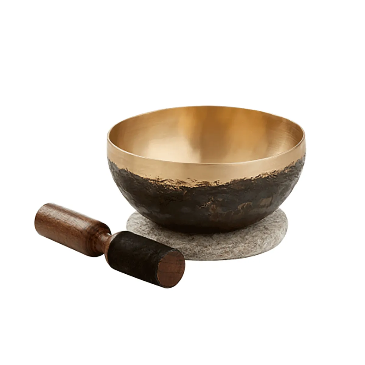 Um Meditationen zu begleiten, ist diese Klangschale gemacht. Ihre Antik-Optik weist darauf hin, dass es sich hier um eine alte Handwerkskunst und ein höchst spirituelles Instrument handelt. Der Klang hat eine transformative Kraft. Lass dich davon einhüllen und spüre, wie sich Geist und Seele erheben. Handarbeit aus Nepal. Messing, Ø ca. 12 cm, Gewicht ca. 300 g, inklusive Holzklöppel, ca. Ø 2,3 x L. 13 cm und Filzuntersetzer aus 100 % Schafwolle, ca. B. 11 x L. 9 x H. 0,8 cm.