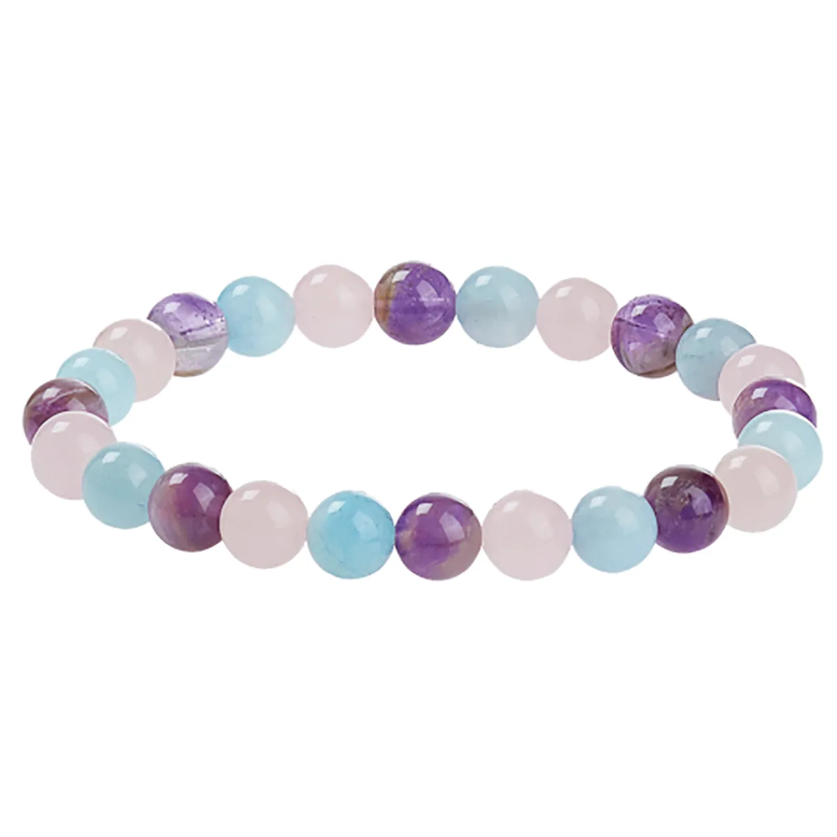 Liebe, Hellsichtigkeit und Ruhe sind die kraftvollen Botschaften in diesem schönen Edelstein-Armband, das auch farblich fein abgestimmt ist. Die energievolle Kombination ist für jede Frau gedacht, die sich auf sich selbst verlassen will oder muss. Mit diesen kraftvollen Impulsen kann sie klar ihre Richtung erkennen und in Ruhe und Liebe die richtigen Entscheidungen treffen. Sie kommen aus dem Herzen. Amethyst, Rosenquarz, Aquamarin, B. ca. 0,8 cm. Jedes Stück ist ein Unikat.