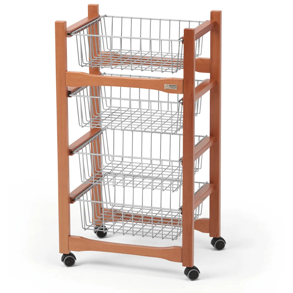 81 x 46 x 34 cm, Buchenholz, Metall, 4 Schiebekörbe, schwenkbare Räder, kratzfester Gummi, fertig montiert (bis auf Rollen), hergestellt in Italien.