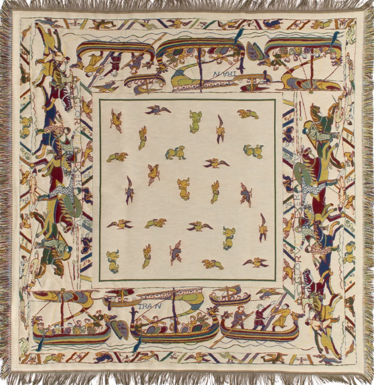 Am Rand dieses schönen Tuchs sieht man, wie die Segel sich im Wind blähen und die Schiffsmasten von mehreren Seilen gehalten werden müssen. Alles ist bereit für die Überfahrt nach England. Dort setzte man die Reise zu Pferde fort. Die herrlichen Fabelwesen der Bordüren schmücken zusätzlich die Mitte der schönen Decke. Die Vorlage für diese bezaubernde Arbeit, der sogenannte »Teppich von Bayeux«, zählt zu Recht zum Weltkulturerbe. Um 1070 entstanden, ist dieser Wandbehang eines der bedeutendsten Kunstwerke des Hochmittelalters. 58 Einzelszenen zeigen die Eroberung Englands durch den Normannenherzog Wilhelm dem Eroberer. Bekannt ist der bestickte Wandbehang für seine Liebe zum Detail. Dieses zauberhafte und mit dem berühmten Bildmotiv des »Teppich von Bayeux« versehene Tuch stammt aus Belgien. Dort leitet Tom Deleenheer, der früher ein Geschäft für Spitzen und Wandteppiche im Zentrum von Brüssel führte, heute das Unternehmen einer belgischen Klöppelfamilie in vierter Generation. Die Produkte werden auf modernen Jacquardwebstühlen gewebt, die die beste Qualität produzieren. Die Produkte aus Belgien, die Sie bei uns bestellen können, zeigen feinste Details, was Motive und Farben angeht, die den Originalen sehr nahe kommen. Sehen Sie sich hier bei uns im Shop gerne weitere Wandteppiche, große Tragetaschen und auch Kissenhüllen aus Belgien an. Wir freuen uns auf Ihre Bestellungen.