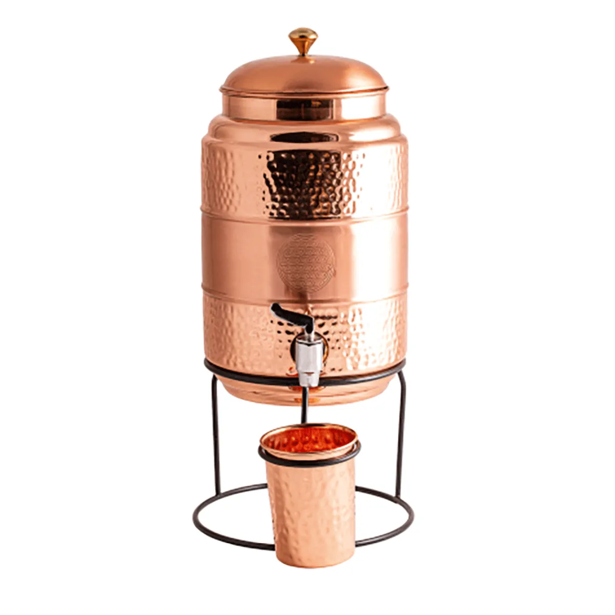 Die Kupferkaraffe 5 l ist ideal für größere Familien oder Seminare und Büros. Sie sorgt nicht nur für gesundes, hochwertiges Wasser, sondern ist auch noch ein echter Hingucker für ein edles Ambiente. In der Mitte ist eine Blume des Lebens eingraviert für besonders energetisch hochwertiges Wasser. Diese Karaffe wird mit Ständer, Ausgießhahn und einem Kupferbecher geliefert. Handgehämmertes Kupfer mit Blume des Lebens, Ausgießhahn aus verchromtem Messing. Inkl. Ständer und 300 ml Kupferbecher. Inhalt 5 l, H. 41 cm, Ø 17 cm.Hinweis: Nicht spülmaschinengeeignet. Kohlensäure kann zu Reaktion mit Kupfer führen. Bitte nur mir stillem Wasser füllen.