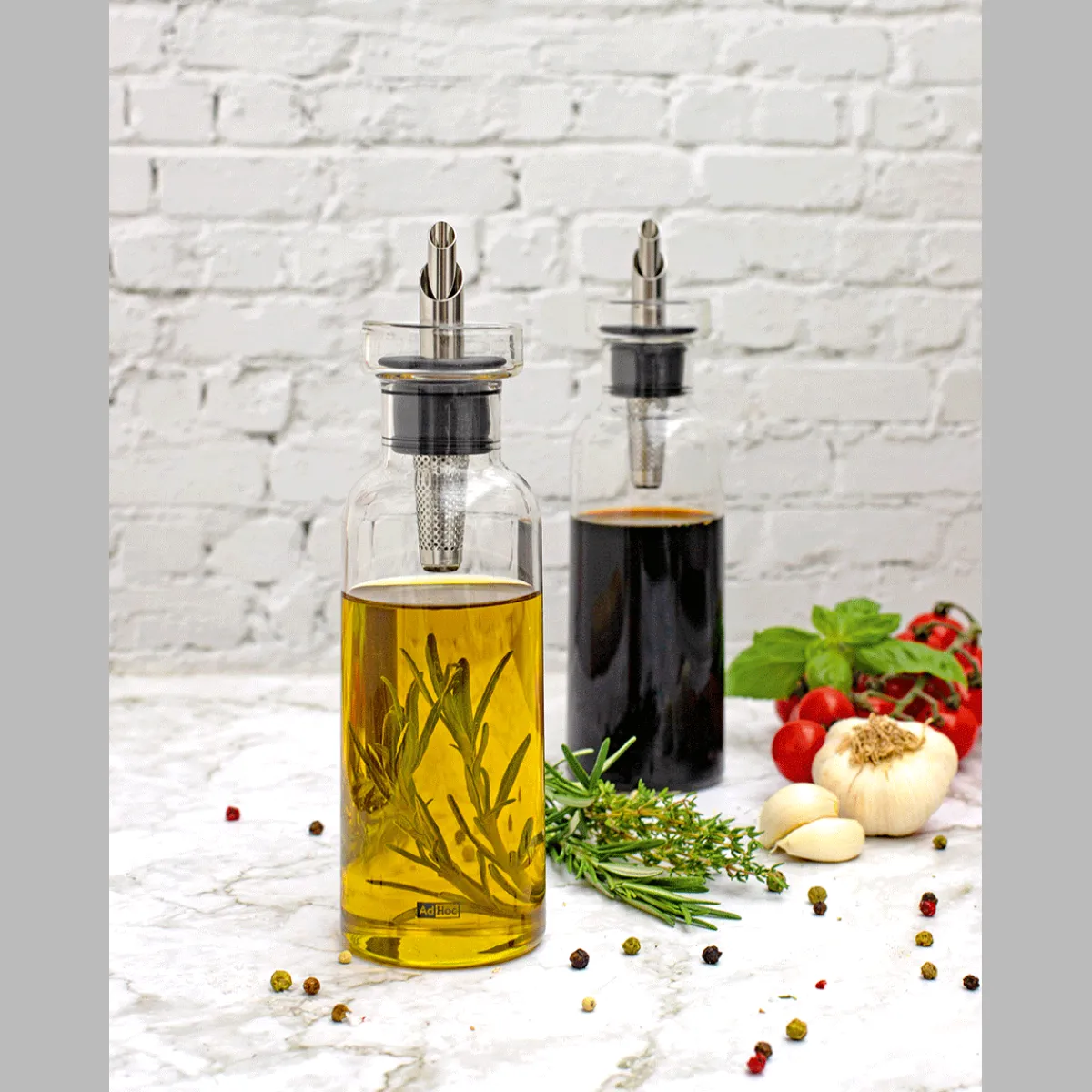 Flaschenset für feines Olivenöl, aromatisches Kürbiskernöl, edlen Balsamico oder Weißweinessig. Dabei vereinen die Flaschen gleich vier Funktionen in einem: Ein tropffreier Ausgießer leitet aufgefangene Flüssigkeit über die Mitte des Spenders zurück in die Flasche; der integrierte Kugelverschluss hält die Flaschen luftdicht, sicher und sauber; ein Edelstahlfilter im Innern fängt Kräuter, Knoblauch, Chilis und Co. beim Gießen auf, und ein spezielle Belüftungssystem sorgt für genaues und sparsames Dosieren. Die Füllmenge der Flaschen beträgt jeweils ca. 300 Milliliter. Zum Reinigen können alle Teile problemlos in die Spülmaschine. Ausgeklügeltes System, einfache Handhabe!