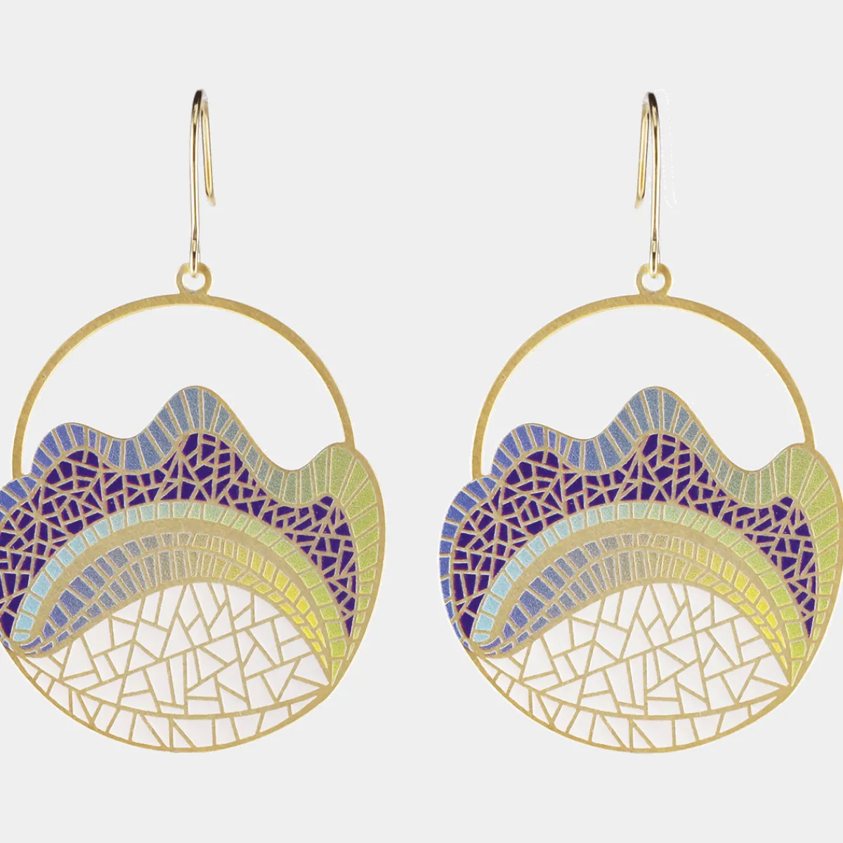 Dieser Ohrschmuck feiert die Kunst eines großen Meisters der Architektur, Antonio Gaudi (1852-1926). Gaudi war ein spanischer Architekt und der berühmteste Vertreter des katalanischen Modernismus. Gaudís Werk war zu seiner Zeit revolutionär, da er Pflanzen und Tiere mit Hilfe der Trencadis-Technik darstellte. Trencadis ist eine Art von Mosaik aus Keramiksplittern, die typisch für die katalanische Architektur ist. Die Suggestion eines zusammenhängenden Musters und der abrupte Übergang zu einem chaotischen Muster sind charakteristisch für das Trencadis. Diese auch als »Pikkolo« bezeichnete Technik ermöglichte es Gaudi, sich an alle Arten von Oberflächen und Konstruktionen anzupassen. Die Ohrringe werden in Spanien von einem Familienunternehmen und Kunsthandwerkern in der dritten Generation hergestellt und zeichnen sich durch ihre extreme Leichtigkeit aus. Die Stücke sind handgefertigt, daher sind gewisse Abweichungen Abweichungen Teil des Charmes des handwerklichen Prozesses.