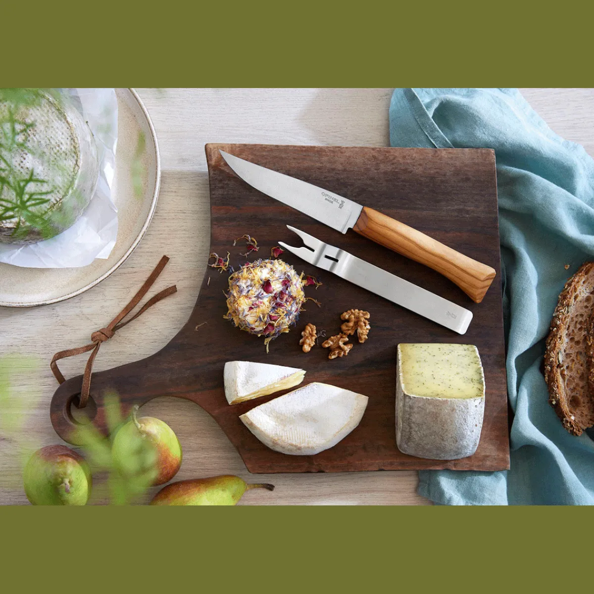 Für Käse-Freunde – mit diesem Set bietet Opinel ein innovatives Produkt für die In- und Outdoor-Küche an. Das Set besteht aus einem Messer mit Buchenholzgriff in der Größe 10, die 12,5 cm lange Klinge besteht aus Edelstahl und ermöglicht das Schneiden jeder Art von Käse. Darüber hinaus bietet das Set als besonderes Extra eine 17 cm lange Gabel aus rostfreiem Edelstahl, mit der der Käse beim Schneiden festgehalten und einfach serviert werden kann. Das Extra: Aufgrund ihres besonderen Designs dient die Gabel auch als Messerablage.