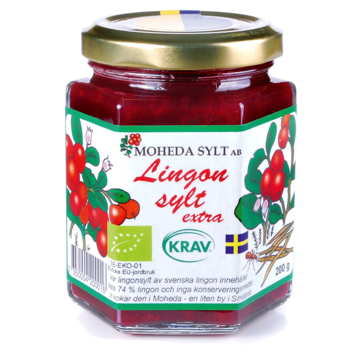 Diese Preiselbeer-Konfitüre wird nach einem alten, traditionellen Rezept hergestellt. Bemerkenswert ist der hohe Fruchtgehalt von 74%, der der Konfitüre einen intensiven Geschmack gibt. Mit ihrem eigentümlichen bitter-süß-säuerlichen Aroma ist die Preiselbeere, zu Konfitüre verarbeitet, eine tolle Bereicherung in Müsli, Haferbrei, Gebäck und nicht zuletzt als Beilage zu Wild- und anderen Fleischgerichten sowie herzhaften Pasteten. In der schwedischen Küche ist die Preiselbeer-Konfitüre Pflicht – sie zählt für die meisten dort zu den traditionsreichen und selbstverständlichen Beilagen einer gedeckten Tafel. Selbstverständlich wird die Konfitüre nur aus natürlichen Zutaten in Bio-Qualität und ohne Konservierungsstoffe hergestellt. Moheda Sylt ist ein kleiner Familienbetrieb, der in Moheda, in der schwedischen Provinz Småland, beheimatet ist. Hier wird hochwertige Konfitüre nach den Richtlinien von KRAV, einem schwedischen BIO-Siegel, hergestellt. (Bio-zert.-Nr. SE-EKO-01)