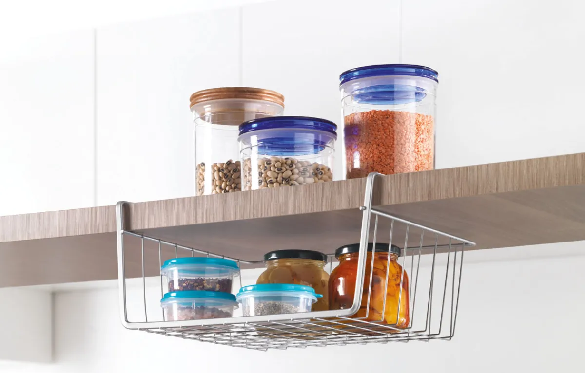 Dieser Schrankkorb ist der ideale Helfer an den Orten, wo normalerweise kein Platz ist. Der Korb lässt sich einfach an Arbeitsplatten oder Regalböden anhängen. Das engmaschige Gitter erlaubt auch kleinere Gegenstände sicher zu verstauen. Küchentücher, Obst oder Topfdeckel finden hier einen neuen Aufbewahrungsort.