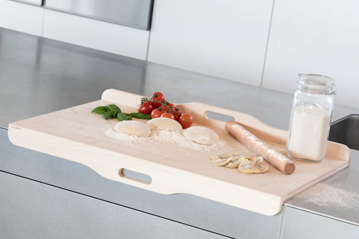 Dieses Backbrett kann alles: Es eignet sich für die Herstellung selbgemachter Nudeln, zum Vorbereiten von Brot- und Pizzateigen, von Keksen oder zum Zubereiten und Schneiden von Gemüse und anderen Zutaten ist es perfekt. Das beidseitig verwendbare Holzbrett hat zusätzlich Griffleisten, damit es bei der Anwendung nicht verrutscht. Zwei hilfreiche Kanten mit Halterungen sorgen dafür, dass es sicher auf dem Tisch oder der Arbeitsplatte liegt. Zur Reinigung muss das hochwertige Nudel- und Backbrett nur mit einem feuchten Tuch abgewischt oder mit einer Bürste, Wasser und etwas Spülmittel gewaschen und anschließend stehend getrocknet werden.