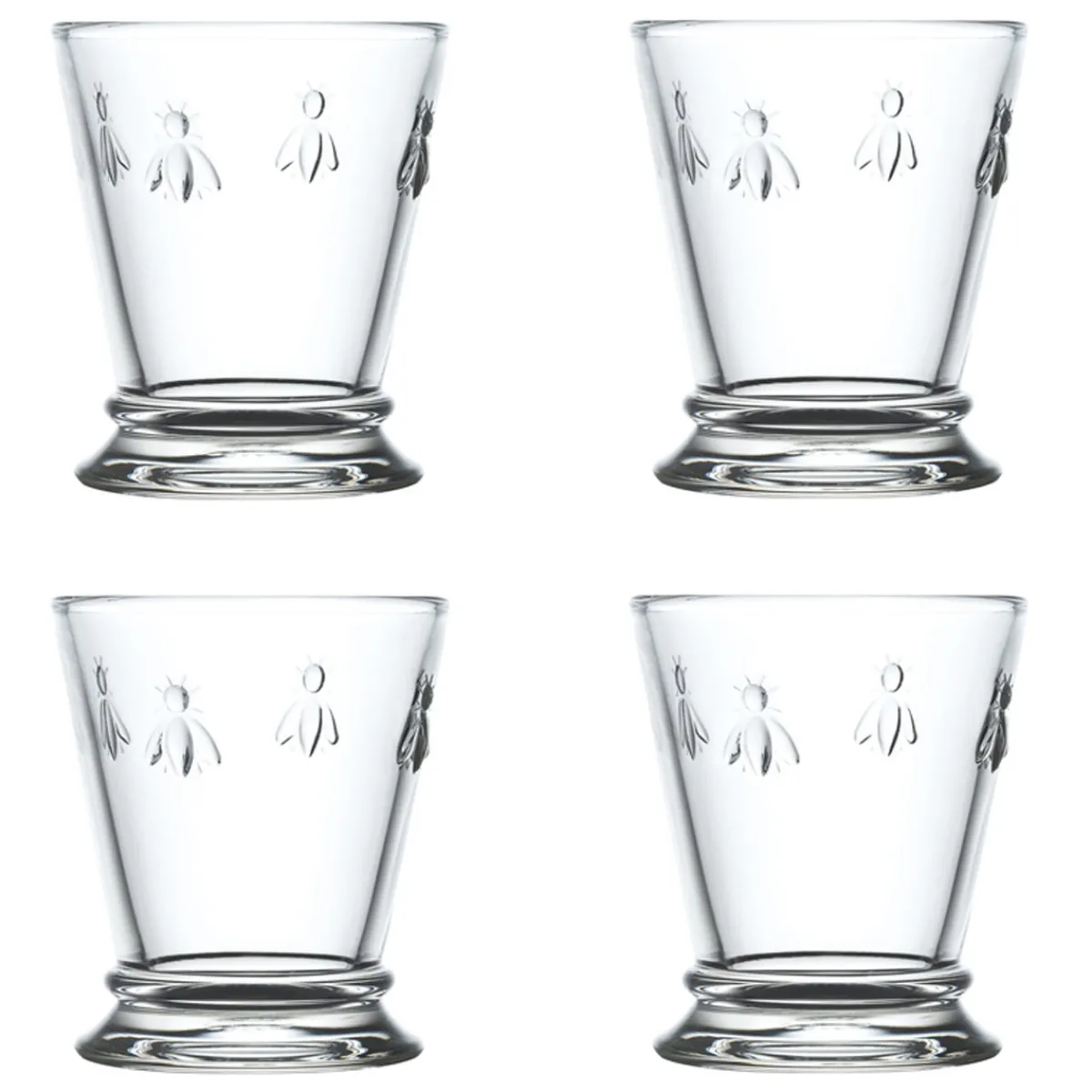 Diese hochwertigen Trinkgläser stammen aus einer der ältesten Glasmanufakturen Frankreichs und der ältesten, die heute noch produziert. Wie früher werden diese Gläser mit Fuß noch heute in traditionellen Holzformen hergestellt. So entstehen die beiden typischen Nähte. Die außergewöhnliche Serie aus dickem robustem Glas trägt das Wappentier der Dynastie der Bonapartes: die Biene. Als Napoleons zum Kaiser gekrönt wurde, brauchte er neue Symbole und Erkennungszeichen. Als Wappentier wählte er die Biene. So war sie auf Hofmänteln, Lederwaren und Polstern, Teppichen und Fahnen abgebildet. Als Inspiration für diese Kollektion diente ein Reise-Necessaire aus blauem Leder mit kunstvollen goldenen Verzierungen und Bienenmotiv, das dem Kaiser gehörte und das im »Carnavalet-Museum« aufbewahrt wird.