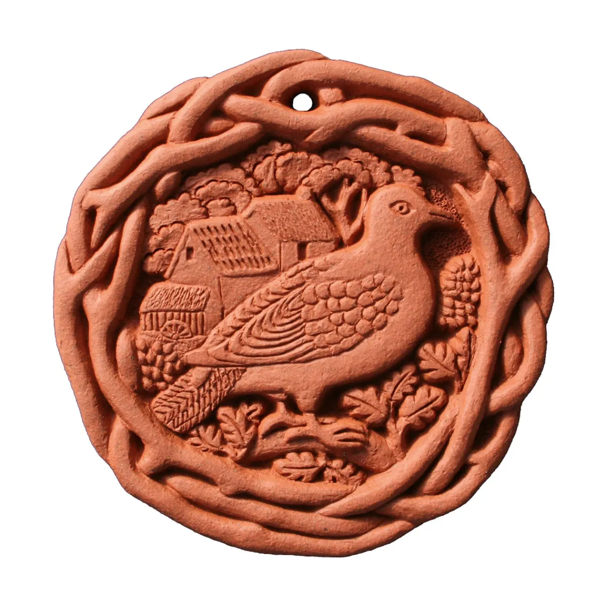 In diese Wandfliese aus Terrakotta »Turteltaube« wurde ein filigranes Vogelmotiv eingebrannt: Sie sehen in der runden, detailreich gestalteten Fliese eine europäische Turteltaube und im Hintergrund ein kleines Dorf, umrankt von Pflanzen und Blüten. Die Turteltaube ist ein kleiner hübscher Vogel, der hauptsächlich in Waldgebieten im Süden und Osten Englands vorkommt. Turteltauben sind Sommerbesucher in Europa, denn im Winter machen sie sich auf einen beschwerlichen und gefährlichen Weg und fliegen nach Afrika südlich der Sahara. Auf ihrer Reise kommen viele ums Leben, sodass diese Taubenart bereits vom vom Aussterben bedroht ist. Wenn auch Sie ein Taubenliebhaber oder Fan schöner, handgemachter Dekorationen sind, wird Ihnen diese wetterfeste Terrakotta-Wandfliese »Turteltaube« mit Sicherheit gefallen. Wir haben sie bei einem kleinen englischen Unternehmen in Bath gefunden! 1975 begann das Ehepaar, Philippa und Kennedy Collings, unter dem Namen »Black Dog of Wells« eine Reihe ungewöhnlicher, dekorativer Fliesen zu produzieren. Sie entwickelten ein einzigartiges Verfahren, um diese aus natürlichem Terrakotta herzustellen. Für die Entwürfe reproduzierten sie sowohl historische als auch traditionelle Quellen. Kennedy nämlich war studierter Historiker, seine Frau studierte Töpferin und Illustratorin. Mittlerweile führt der gemeinsame Sohn Daniel die Geschäfte, der zuvor in der kartographischen Industrie tätig war. Er übernahm das elterliche Unternehmen 2002, als sein Vater starb. Seine Mutter ist nach wie vor beratend tätig, auch wenn Daniel jetzt die Fliesen entwirft. Mutter und Sohn beziehen ihre immer wieder neuen Ideen auch aus allen möglichen Skizzen und Bildern, die sie im Laufe der Jahre gesammelt haben, u.a. Schnitzereien in Holz, Steinarbeiten, Manuskripte, Wandteppiche und Stiche.