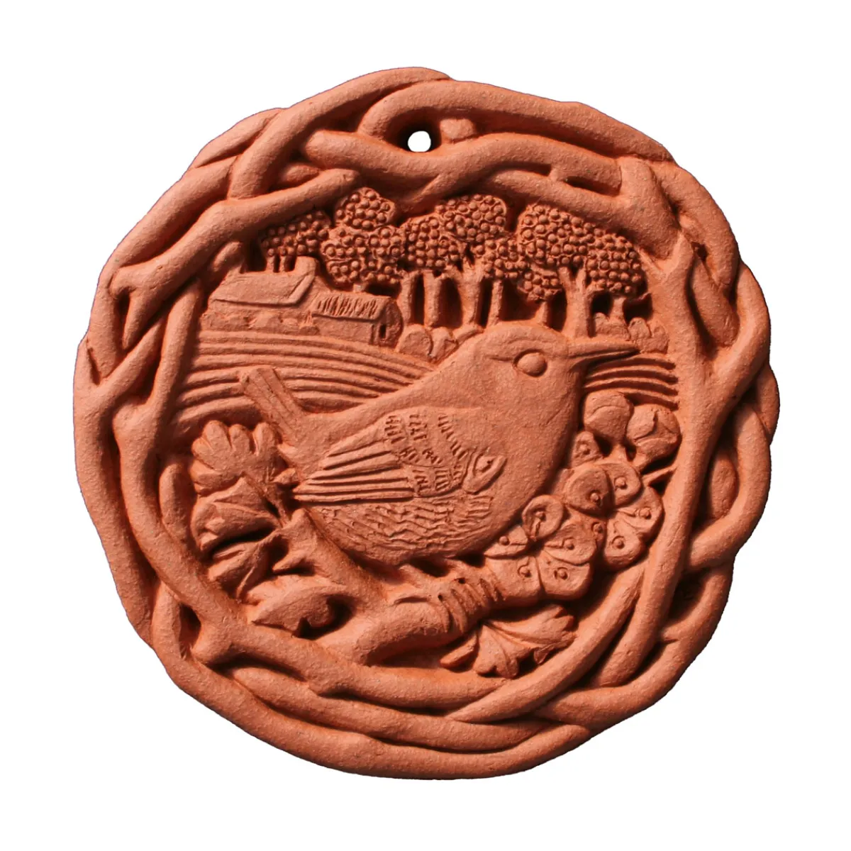 Oh, wie herzig, da sitzt ein kleiner Zaunkönig auf einem blühenden Ast, im Hintergrund ein gefurchtes Feld, an dessen Rand wohl ein Bauernhof liegt! Dieses wundervolle Motiv sehen Sie auf der wetterfesten, handgebrannten Fliese aus Terrakotta »Zaunkönig«. Wir haben das dekorative Bild aus England, denn dort ist der Zaunkönig einer der am häufigsten vorkommenden Brutvögel. Trotz seiner winzigen Größe (6-10 cm) hat der Zaunkönig einen recht lauten Ruf, der Sie schnell darauf aufmerksam macht, dass er da ist. Sein Lebensraum erstreckt sich über Gärten, Wälder, Parks, Moore und Ackerland – eben wo es möglichst ausreichend Insekten und Spinnen für ihn gibt. Die Zucht findet im Frühjahr statt, wobei die Männchen Gebiete markieren, indem sie eine Auswahl von Kuppelnestern bauen, die die Weibchen anfliegen können. Bis zu sieben Eier legt die Zaunkönig-Mutter. Etwa einen Monat später schlüpfen die Vogelkinder und werden schnell flügge. Und nun können Sie sich diese runde Fliese wunderbar in der Wohnung, aber auch auf dem Balkon, einer Terrasse oder an der Hauswand aufhängen. Eine Lochbohrung befindet sich ganz oben in der Mitte.