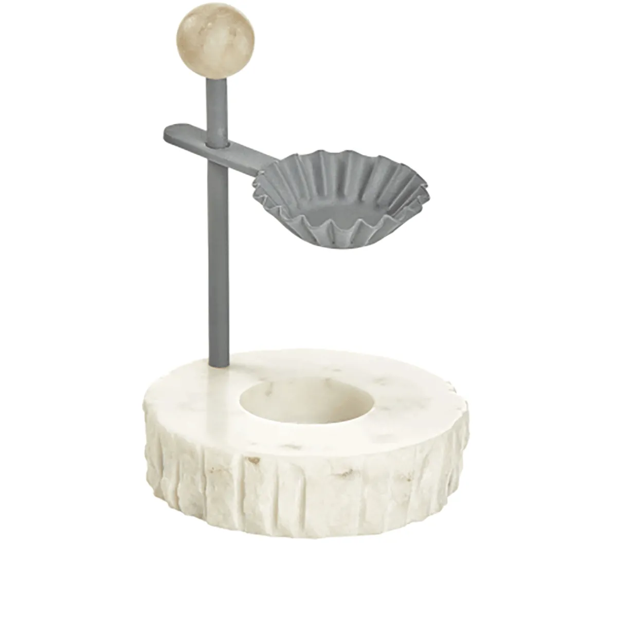 Weißer, lichtvoller Marmor macht dieses Weihrauchstövchen zu einem edlen Schmuckstück. Die kleine Räucherpfanne ist ideal für Harze, insbesondere für Weihrauch. Und sie ist höhenverstellbar. So kannst du dich bei jeder Räucherung neu entscheiden – für einen dezenten Duft oder für eine intensive Wirkung. Marmor, Eisen, H. ca. 15 cm, Ø ca. 10 cm.