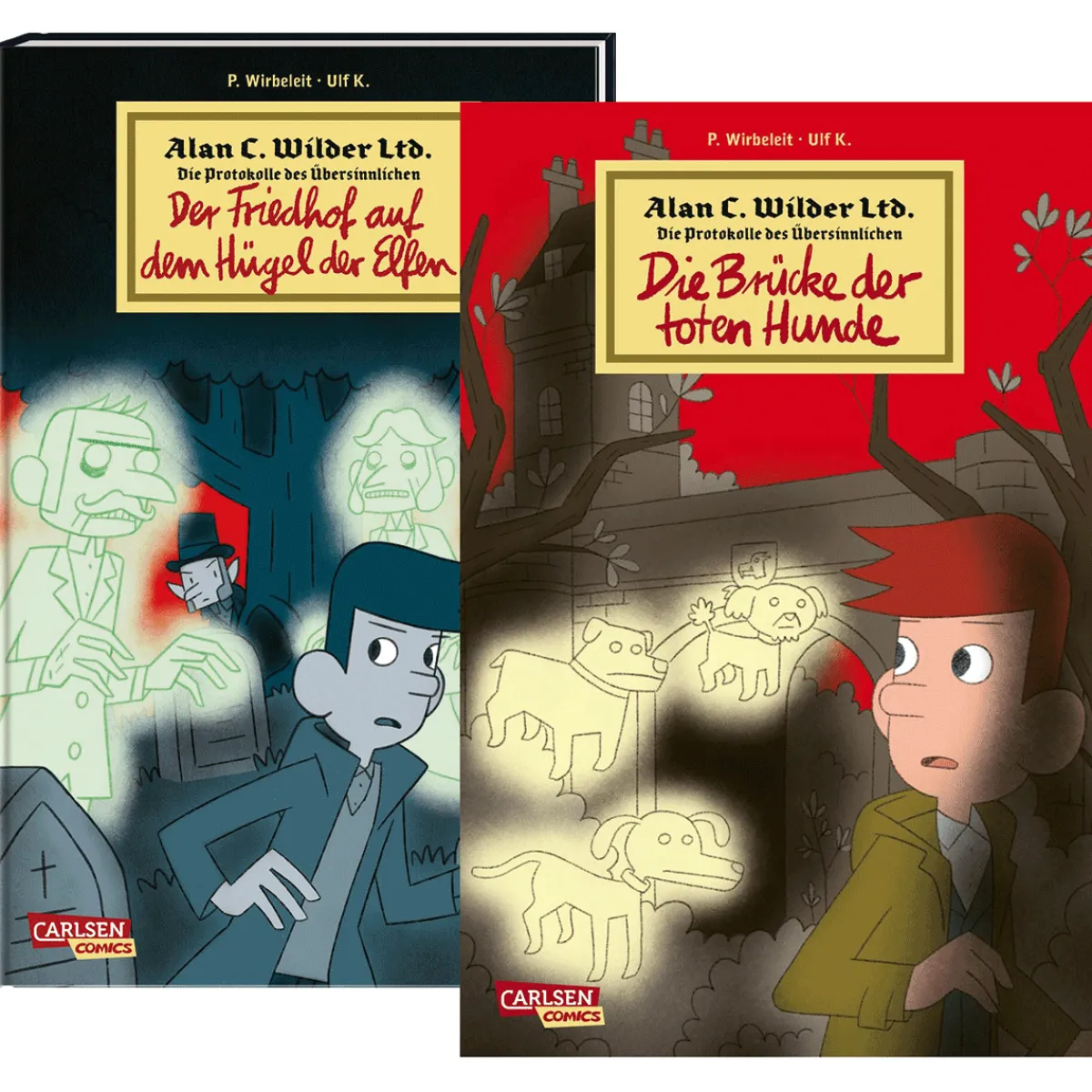 Dieses Set enthält: »Die Brücke der toten Hunde« Die Gabe, Gespenster, Poltergeister und Dämonen wahrzunehmen, ist nichts für schwache Nerven! Und seit Alan nach dem Tod seines Vaters die Firma Wilder Ltd. übernommen hat, werden seine Nerven weit mehr strapaziert, als ihm lieb ist – bietet sie doch »Hilfe bei übersinnlichen Phänomenen aller Art«. Gleich sein erster Fall führt Alan auf die unheilvolle Brücke der gruseligen Lady Dunsford. Mit Alan C. Wilder haben Patrick Wirbeleit und Ulf K. einen so unerschrockenen wie witzigen jugendlichen Geisterjäger erschaffen, dessen Abenteuer selbst John Sinclair ins Bockshorn jagen würden. »Der Friedhof auf dem Hügel der Elfen« Am Rande von Inverness in den schottischen Highlands erhebt sich Tomnahurich, der »Hügel der Elfen«. Ausgerechnet an diesem sagenumwobenen Ort des kleinen Volks errichteten die Menschen im 19. Jahrhundert einen ihrer Friedhöfe. Ein Friedhof, auf dem mehr als hundert Jahre später die Geister der Toten aus ihren Gräbern steigen. Als eines Abends zu später Stunde ein seltsamer kleiner Mann um eine Unterredung mit Alan C. Wilder bittet, jagt dessen Anliegen selbst dem erfahrenen Geisterjäger einen Schauer über den Rücken. (Ab 9 Jahre)