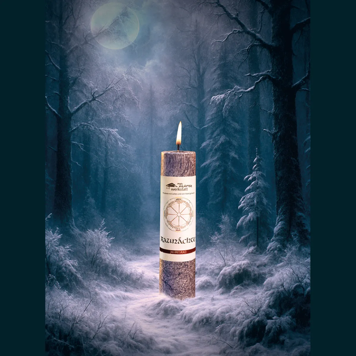 Eine kleine Manufaktur in den Allgäuer Alpen stellt die von Hand gegossenen Kostbarkeiten her, die so schön gleichmäßig abbrennen. Grundlage bilden 100% pflanzliche Stearine aus Resten der europäischen Olivenölproduktion. Hinzugefügt werden Pflanzen oder Harzauszüge, Heilkräuteressenzen, naturreine Öle und Tinkturen aus biologischem Anbau oder Wildsammlung. Für eine Rückschau auf das alte Jahr und die Einstimmung auf das neue ist das Licht dieser dezent grauen, fast ein wenig magisch anmutenden Kerze ein wundervoller Begleiter. Die Raunächte beginnen am 25. Dezember und enden als wichtiger Perchtentag am 6. Januar – die 13. Nacht dreht das Rad weiter – es bleibt nicht stehen. Zeit der Anderswelt – Grenzwanderung: Durch entzünden der Kerze und Räuchern haben wir Schutz, aber auch die Möglichkeit die Türen zu öffnen für die Anderswelt, um mit ihr zu kommunizieren, sich mit ihr zu verbinden. Zeit des Dankens, Rückschau, Loslassen, Verabschieden, Orakeln, Visualisieren und Neues einladen.