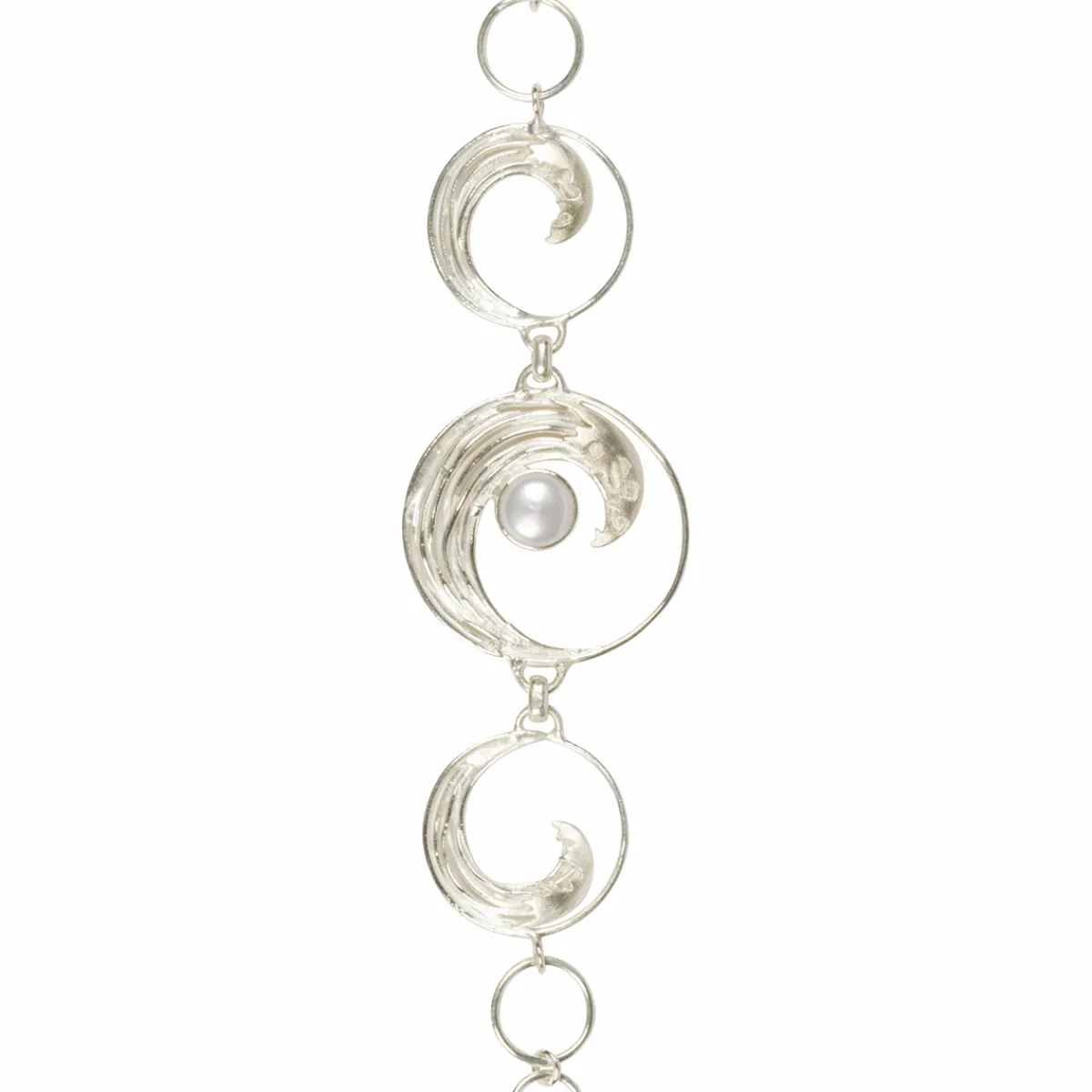 Dieses ungewöhnliche Silber-Armband zeigt in formidabler Weise den Ausschnitt eines weltberühmten Holzschnitts. Erkennen Sie die »Welle« von Katsushika Hokusai (1760 bis 1849)? Hokusai war einer der großen Meister des japanischen Holzschnitts. Er wurde im Westen erstmalig durch seinen gewaltigen Einfluss auf die Impressionisten, z.B. Gauguin, Van Gogh und Toulouse-Lautrec, bekannt. Auch die Designerin Paula Bolton liebt die Holzschnitte des großen japanischen Meisters und hat deshalb ein Schmuck-Ensemble entworfen, das aus diesem Armband, einer Kette sowie Ohrsteckern besteht. Bolton lebt und arbeitet in einem Cottage aus dem 16. Jahrhundert in einem idyllischen Dorf im ländlichen Kent. Sie ist verheiratet und hat zwei Kinder und sechs Enkelkinder. Für ihre Entwürfe lässt sie sich immer wieder aufs Neue durch ihre ausgedehnten Reisen, durch Besuche bei Kunstausstellungen und der Natur um sie herum inspirieren. Sie selbst besitzt einen wundervollen, ummauerten Garten. Ihr Urgroßvater war ebenfalls ein abenteuerlustiger Unternehmer, und ihr Vater und Großvater wurden beide in Japan geboren. Die Vorfahren ihrer Mutter waren holländische Kaufleute, die im 18. Jahrhundert in den Osten segelten. Paula Bolton lernte auf Reisen auch die Hersteller für ihre Schmuckstücke kennen, denn diese werden auf Bali nach ihren Vorgaben hergestellt.