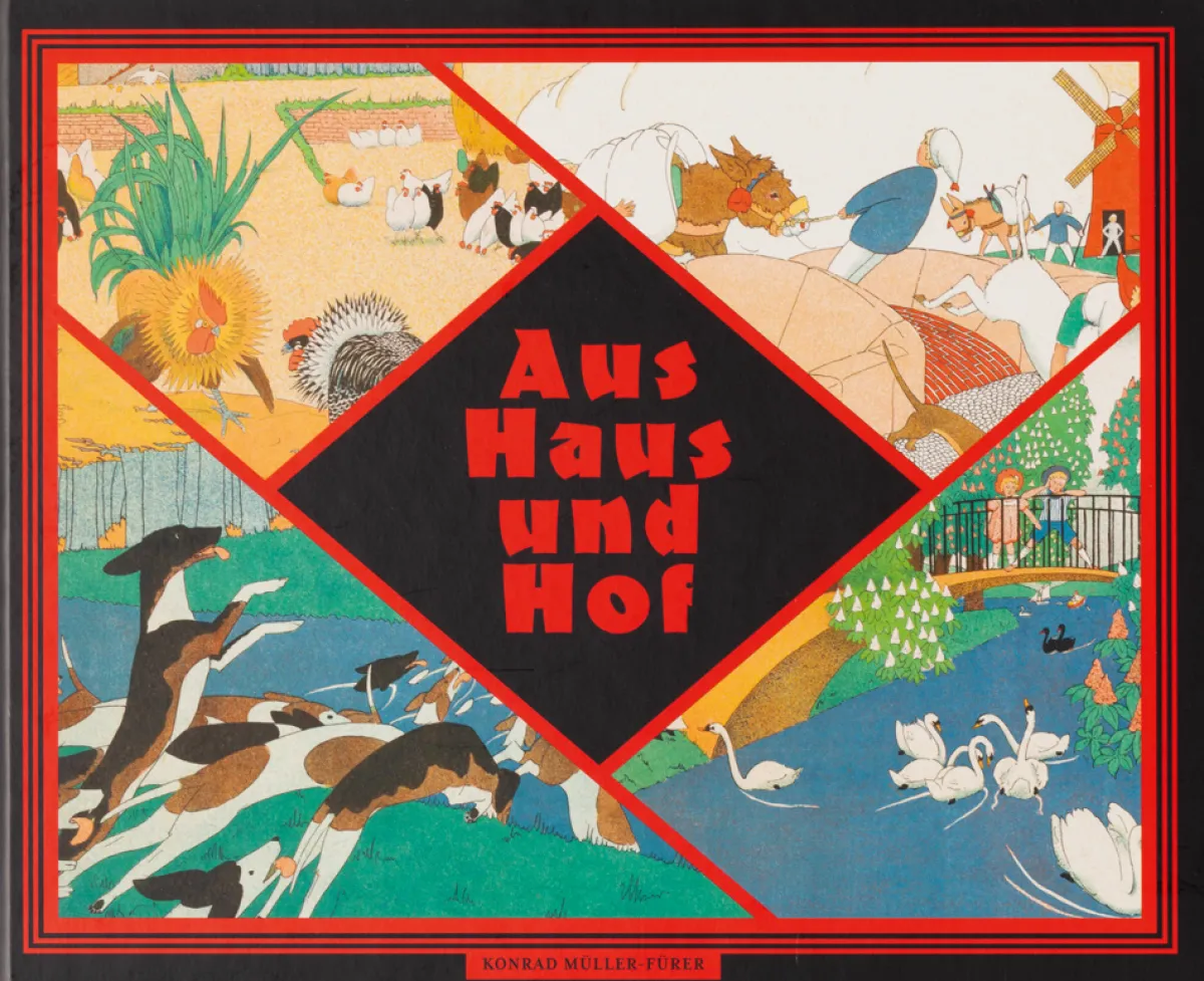 Dieses ausgefallene Bilderbuch im Stil des Art Déco erschien 1921 in einem kleinen niederländischen Verlag. Es zeigt auf 12 ganzseitigen Lithografien Szenen aus dem Landleben und der Stil dieses Buches erinnert an Arbeiten von K. F. Freyhold und Karl Hofer. Die farbenprächtigen Illustrationen zeigen vor allem Tiere in Bewegung. Ergänzt werden sie durch humorvolle Kinderreime. Über den Künstler Konrad Müller-Fürer ist sehr wenig bekannt. Er stand den Waldorfschulen nahe und unterrichtete an der 1904 von der Tänzerin Isadora Duncan und ihrer Schwester Elizabeth in der Villenkolonie Grunewald bei Berlin gegründeten »Barfuß«-Tanzschule.