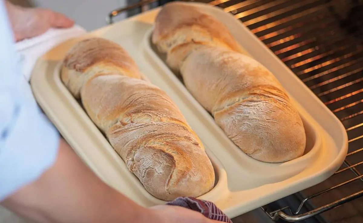 Mit dieser Backplatte gelingt Ihnen ein gutes Baguette – oder gleich zwei – mit herrlich knuspriger Kruste und saftiger lockerer Krume. Für Kenner gehört Baguette zu Aufschnitt und Pasteten, zu Suppen, Ratatouille, Salat oder zur feinen Käseplatte dazu. Die patentierte Platte aus wärmespeichernder, unglasierter und atmungsaktiver Keramik wird von Hand hergestellt; ihre Farbe changiert in natürlichen Brauntönen. Auf der Oberseite befinden sich Vertiefungen für zwei Brote und eine umlaufende Backrinne, in die etwas Wasser gefüllt wird. Durch eine gleichmäßige Verdunstung während des Backens bildet sich ein Feuchtigkeitsschirm, der für wunderbare Backergebnisse sorgt. Auch Kuchen und Hefegebäck lassen sich in der Keramik und mit etwas Feuchtigkeit bestens zubereiten. Die Platte kann problemlos von Hand gereinigt werden. Sie sollte anschließend an einem gut belüfteten Ort stehen, damit sie wieder vollkommen trocknen kann. Handgefertigt in der Keramik-Manufaktur Denk, seit 1964.