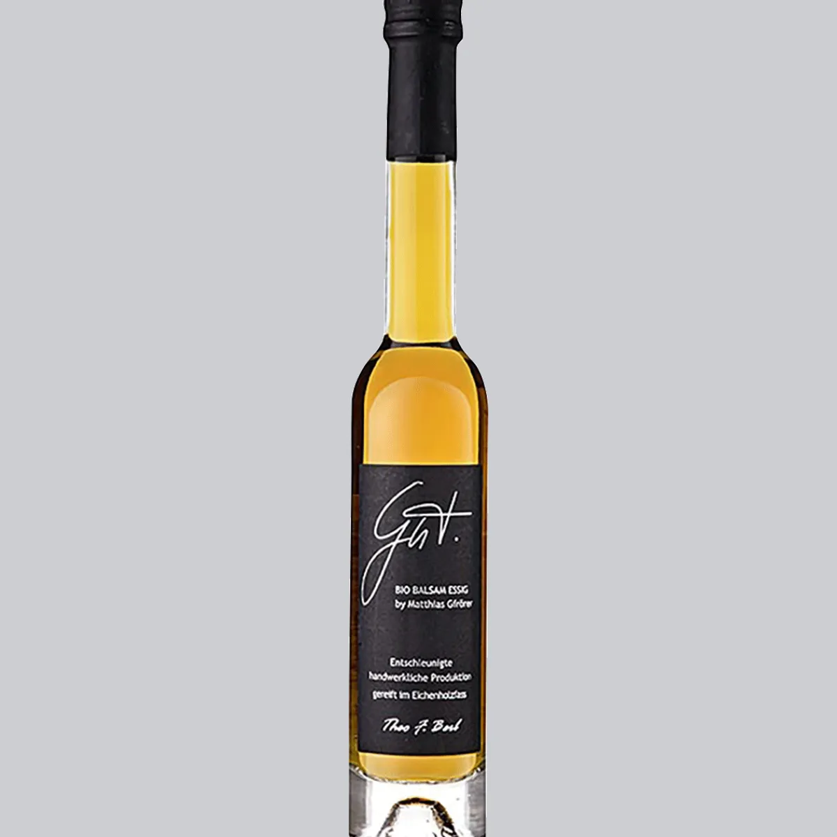 Regionale und nachhaltige handwerkliche Produkte von der »Gutsküche« und dem Hofladen »GutsDeli« auf dem Gut in Wulksfelde bei Hamburg gibt es jetzt über regionale Grenzen hinaus. Rebecca und Matthias Gfrörer haben ihr Handwerk in den Sterneküchen weltweit erlernt, aber erst in ihrer Gutsküche können sie ganz zeitgemäß sein, nach ihren Vorstellungen saisonal, naturverbunden und mit Raffinesse kochen und ihre Produkte kreieren. Der Balsamessig aus Weißwein aus biologischem Anbau ist liebevoll handgemacht und reifte in alten Eichenholzfässern. (bio-zert. DE-ÖKO-003)