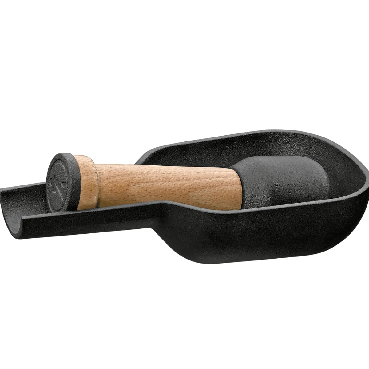 17,5 x 8,5 x 4,5 cm, Gusseisen, Buchenholz, nicht spülmaschinengeeignet.