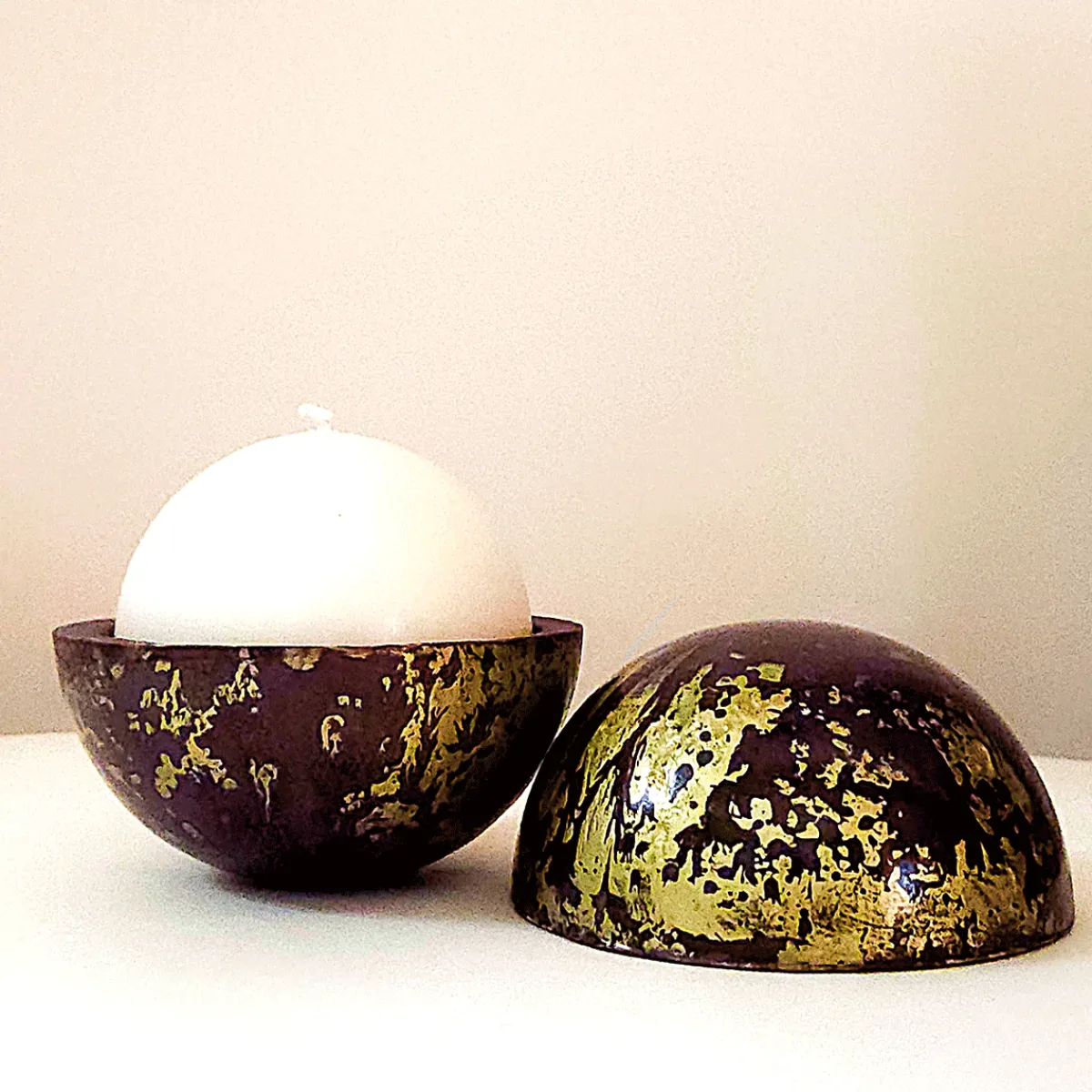 Geschlossen sieht diese schimmernde Kugel aus wie eine imaginäre Weltkarte. Im Inneren dieser schwarz und golden schimmernden Kugel verbirgt sich eine handgefertigte Kerze, die einen intensiven, holzigen und mild herben Duft nach Tonkaholz verströmt. In einer kleinen Manufaktur im Loire-Tal fertigt Hélène Chevereau diese besonderen Duftkerzen, inspiriert von der Natur, die sie umgibt. Ihr Credo ist es, Geschichten zu erzählen, die einen neuen Blick auf die Welt ermöglichen. Die Düfte ihrer Kerzen sollen anregen und auf Gedankenreisen begleiten, die Globus- oder Muschelform der Kerze versinnbildlicht dabei das Geheimnisvolle, Endlose des Kreises, der den Lauf der Natur und des Kosmos repräsentiert. Hergestellt werden die duftenden Globen in Handarbeit aus reinem Rapswachs, bei ihrer Verbrennung werden keine keine giftigen oder umweltschädlichen Substanzen freigesetzt. Die Textur der Kerzen ist cremig und glatt, sei brennen langsam ab und erzeugen eine sehr weiche Flamme. Alle Duftkerzen sind biologisch abbaubar, gentechnikfrei, pestizidfrei und nicht an Tieren getestet. Der feine und anregende Duft nach Tonkaholz ist das Ergebnis einer Zusammenarbeit mit dem renommierten Parfümhaus Galimard aus Grasse in der Provence. Die Kugel, die die Kerze umschließt, wird aus dem Werkstoff Jesmonit gefertigt, ein ungiftiges und umweltfreundliches Material, das Farbpigmente mit Metallpulver kombiniert, wodurch ein zufälliges und einzigartig edles Aussehen entsteht.
