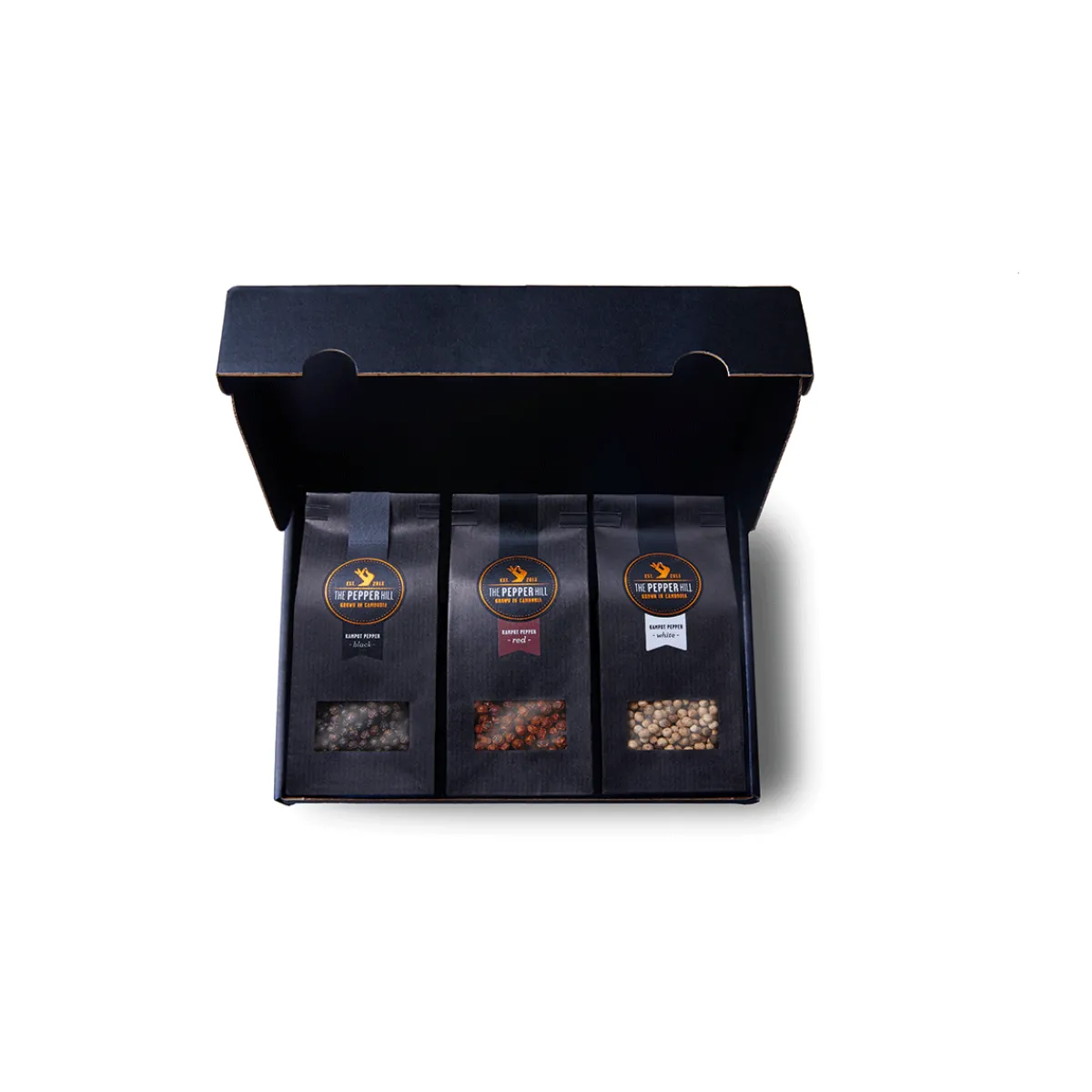Drei Pfeffervariationen in einem Set. Hocharomatischer schwarzer, weißer und roter Kampot-Pfeffer in bester Qualität und mit jeweils unterschiedlichen intensiven Geschmacksprofilen. Frei von künstlichen Zusatzstoffen und Pestiziden. Manchmal sind es die kleinen Dinge, die Großes bewirken. Der Bio-zertifizierte Kampot-Pfeffer von The Pepper Hill aromatisiert Speisen wie kein anderes Gewürz. Es geht um Geschmack, nicht um Schärfe. Kampot Pfeffer ist eine geografisch geschützte Pfeffersorte, die aus der Provinz Kampot in Kambodscha stammt. Dies bedeutet, dass nur Pfeffer, der in der Kampot-Region unter strengen Anbau- und Verarbeitungsstandards produziert wird, als Kampot Pfeffer bezeichnet werden darf. Sein einzigartiger Geschmack wird durch das besondere Klima und den mineralreichen Boden der Region beeinflusst. Er ist bekannt für sein einzigartiges Aroma und seinen Geschmack, der von mild bis hocharomatisch reichen kann. Kampot Pfeffer wird in drei Hauptvarianten angeboten: Schwarz, Weiß und Rot, die jeweils einzigartige Geschmacksprofile aufweisen. (Öko-Kontrollstellencode: DE-ÖKO-039)