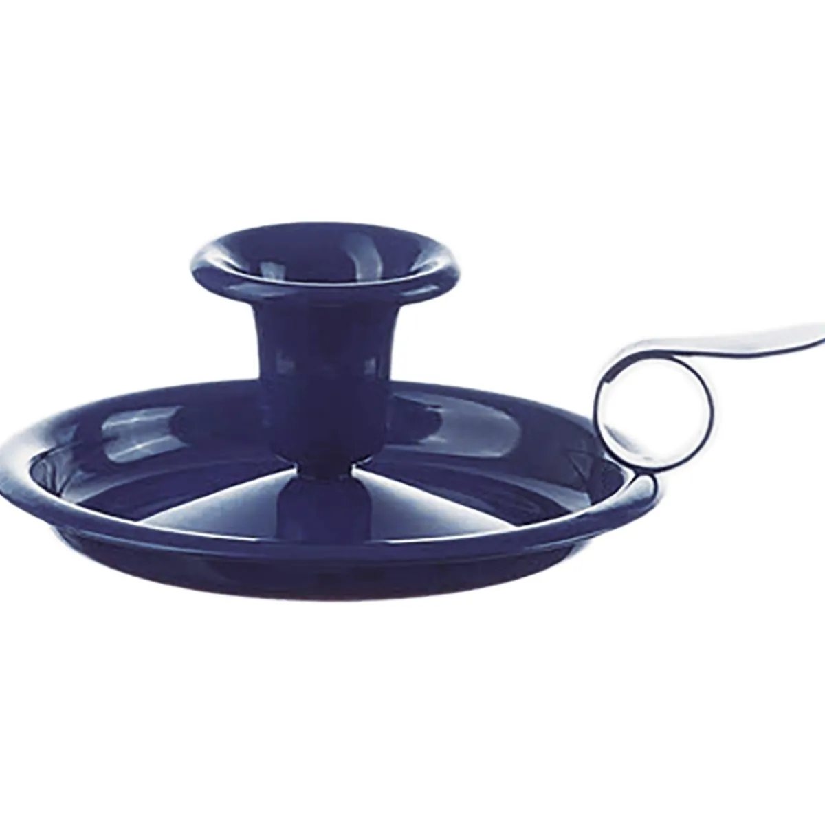 Ganz in glänzendem Dunkelblau kommt dieser Kerzenhalter daher; eine tolle Farbe, mit der Sie weiße Stabkerzen kombinieren können, aber auch farbige in Gelb oder Rot oder Regenbogenfarben. Modelle in der Form diesen Kerzenhalters waren anno dazumal – bevor es elektrisches Licht gab – sehr beliebt, denn wer mit seinem Kerzenständer durchs Haus ging, konnte ihn mittels des Rings sicher in der Hand halten, indem er seinen Daumen oder den Zeigefinger hineinsteckte. Auch die Auffangschale hatte einen Nutzen: Wenn beim Transport Wachs heruntertropfte, landete es in dem fest montierten Teller. Sie können in den blauem Kerzenständer aus pulverbeschichtetem Stahlblech lange Kerzen in allen gewünschten Farben platzieren und das ganze Jahr über als Farbtupfer auf den Ess- oder Wohnzimmertisch platzieren. Sehen Sie sich gerne weitere Kerzenständer bei uns im Shop an, wenn Sie mögen.