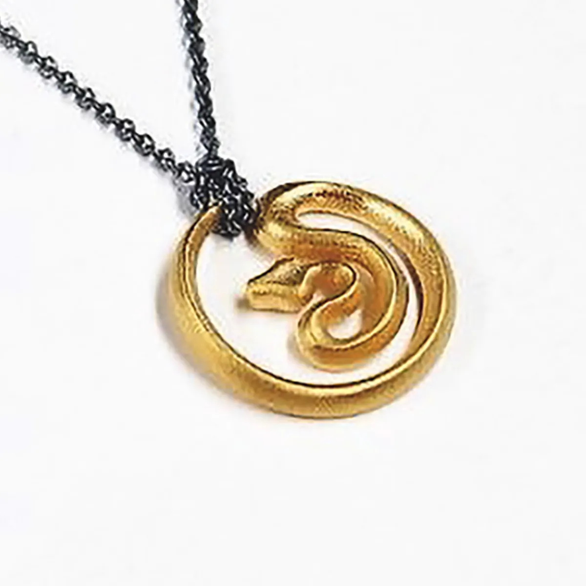 Die goldplattierte Kette aus 750er Sterlingsilber zeigt eine im Kreis verschlungene Schlange und trägt den hübschen Titel »Last Paradise«. Das außergewöhnliche Schmuckstück hängt an einer 45 cm langen Kette, die ebenfalls aus 750er Sterlingsilber besteht, allerdings oxidiert wurde. Ein wundervolles Farbenspiel ergibt sich so durch die zwei unterschiedlich bearbeiteten Materialien. Auf die Idee zu diesem wertvollen Schmuckstück ist der Pforzheimer Schmuckdesigner Christian Guthmann gekommen, der die Kette in seiner Werkstatt mit seinem kleinen Team, bestehend aus versierten Mitarbeitern, fertigt. Der heutige Firmenchef der bereits 1906 gegründeten Manufaktur legt großen Wert auf Nachhaltigkeit: Christian Guthmann fertigt seinen Schmuck ausschließlich in Pforzheim an und bezieht z.B. die Edelmetalle als recyceltes Material von der »Allgemeinen Gold- und Silberscheideanstalt AG Agosi Pforzheim«. Sehen Sie sich gerne auch die zu dieser Schlangen-Kette passenden Ohrringe an!