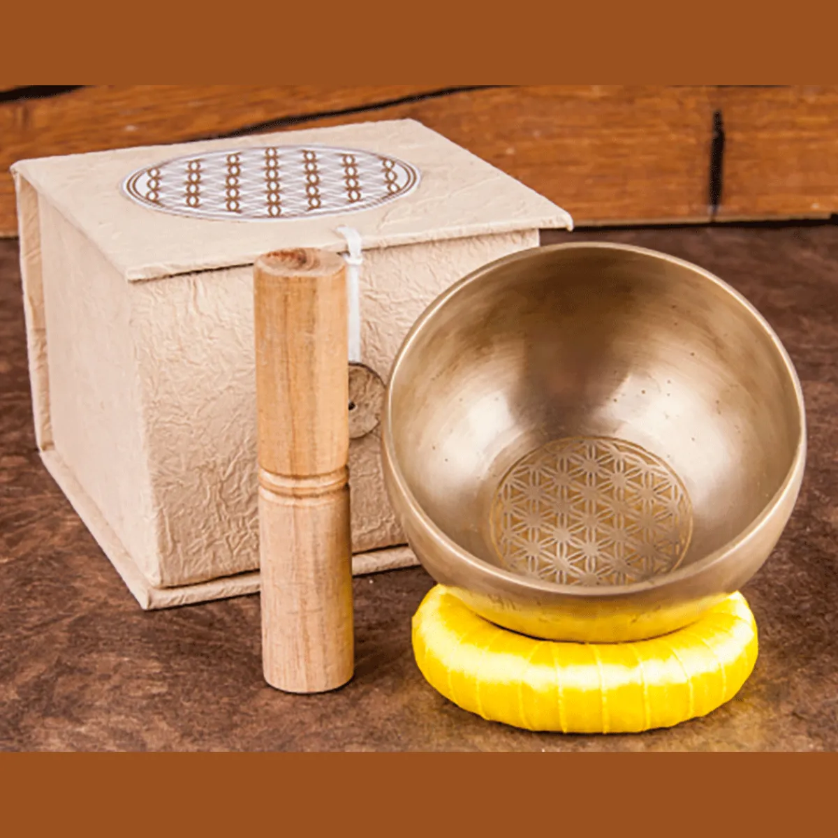 Handgehämmerte Klangschale mit Blume des Lebens Gravur. Diese Klangschalen sehen nicht nur wunderschön aus, sie haben auch eine große Schwingungswirkung. Die Kraft der Blume des Lebens, des Ursymbols für Manifestation schwingt bei jeder Drehung der Klangschale mit und hilft uns tiefer in unsere eigene Mitte zu kommen, Blockaden zu lösen und neue Lebensenergie freizusetzen. Das Set wird mit Unterlage und Stab in einer hübschen Geschenkbox aus Naturpapier geliefert. Geschenkbox 13 x 13 x 8,5 cm, Kissenring Latexschaum mit Satinband überzogen, Schale aus Messing Ø 11 cm.