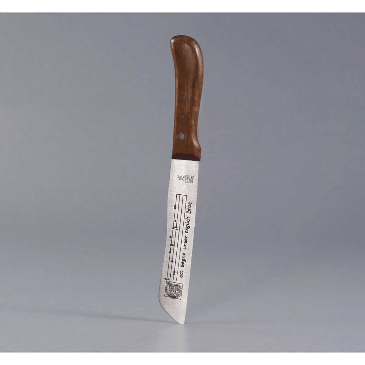 Dieses Brotmesser ist ein echtes Windmühlenmesser, ein so genannter »Hamburger«, und wurde in der Schmiede der Abtei Königsmünster im Stil von Messern der Benediktiner aus dem 16. Jahrhundert hergestellt. Die Form stammt aus dem alten Land vor den Toren Hamburgs, daher der Name. Die nicht rostfreie Klinge ist von Hand geschliffen im Solinger Dünnschliff und feingespließtet (feingeschliffen). Der Griff besteht aus deutschem Kirschbaumholz, das nach althergebrachter Weise mit natürlichen Stoffen behandelt und poliert ist. »Unser tägliches Brot gib uns heute …«. Diese Bitte aus dem Vaterunser muss sich der Mensch unseres Kulturkreises immer wieder bewusst machen. Unsere Vorfahren taten das, indem sie den Brotlaib mit dem Messer bekreuzigten. Das Essen segnen – auf IHN weisen, der der Ursprung aller Nahrung ist. Dabei wird bewusst, dass der Mensch nicht vom Brot allein lebt, sondern ganz auf die Zuwendung Gottes angewiesen bleibt. Italienische Benediktiner des 16. Jahrhunderts wollten dieser Tatsache besonderen Ausdruck verleihen und so ritzten sie in die Klingen ihrer Tafelmesser einen Dankesspruch ein. Die Klinge dieses wertvollen Brotmessers ziert ein altes, überliefertes Tischgebet, von dem jeweils ein Satz pro Klingenseite zu lesen ist: »Gott segne unser täglich Brot. Er schütze uns in aller Not.« Hinweis: Bei Gebrauch wird das Holz leicht aufrauen und seine typische griffige Beschaffenheit erhalten. Von Zeit zu Zeit etwas Öl pflegt das Holz des Griffes und bewahrt seine Farbe. Sie erhalten deshalb gleich ein kleines, ergiebiges Fläschchen bei der Messer-Lieferung.