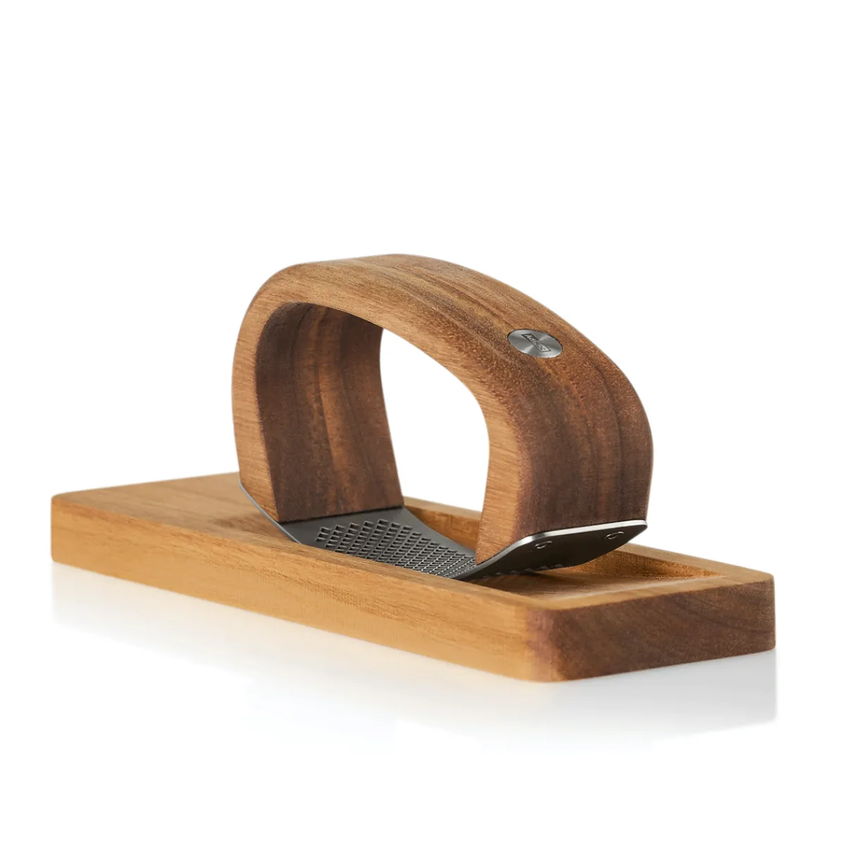Frischer Knoblauch passt zu vielen Gerichten und ist absolut gesund. Fans der tollen Knolle werden sich deshalb über diese Knoblauchwippe mit dem angepasstem Schneidebrett freuen. Die Presse zerkleinert Knoblauchzehen kraftvoll aber schonend im Wiegeschritt und bewahrt essentielle Aromen, denn hier wird nur sanft gepresst. Dafür sorgt die lasergeschnittene Edelstahlklinge mit schönem großem Arbeitsbereich und ein ergonomischer Griff aus Akazienholz, der sich sich perfekt in die Hand legt. Das Schneidebrett aus robustem, natürlichem und lebensmittelechtem Akazienholz mit antibakteriellen Eigenschaften verhindert mit einer passgenauen Mulde das Wegrutschen der Zehen und hält das Wiegemesser auch nach der Arbeit in der Form. Damit Sie an diesem Set lange Freude haben, empfehlen wir eine Reinigung mit der Hand.