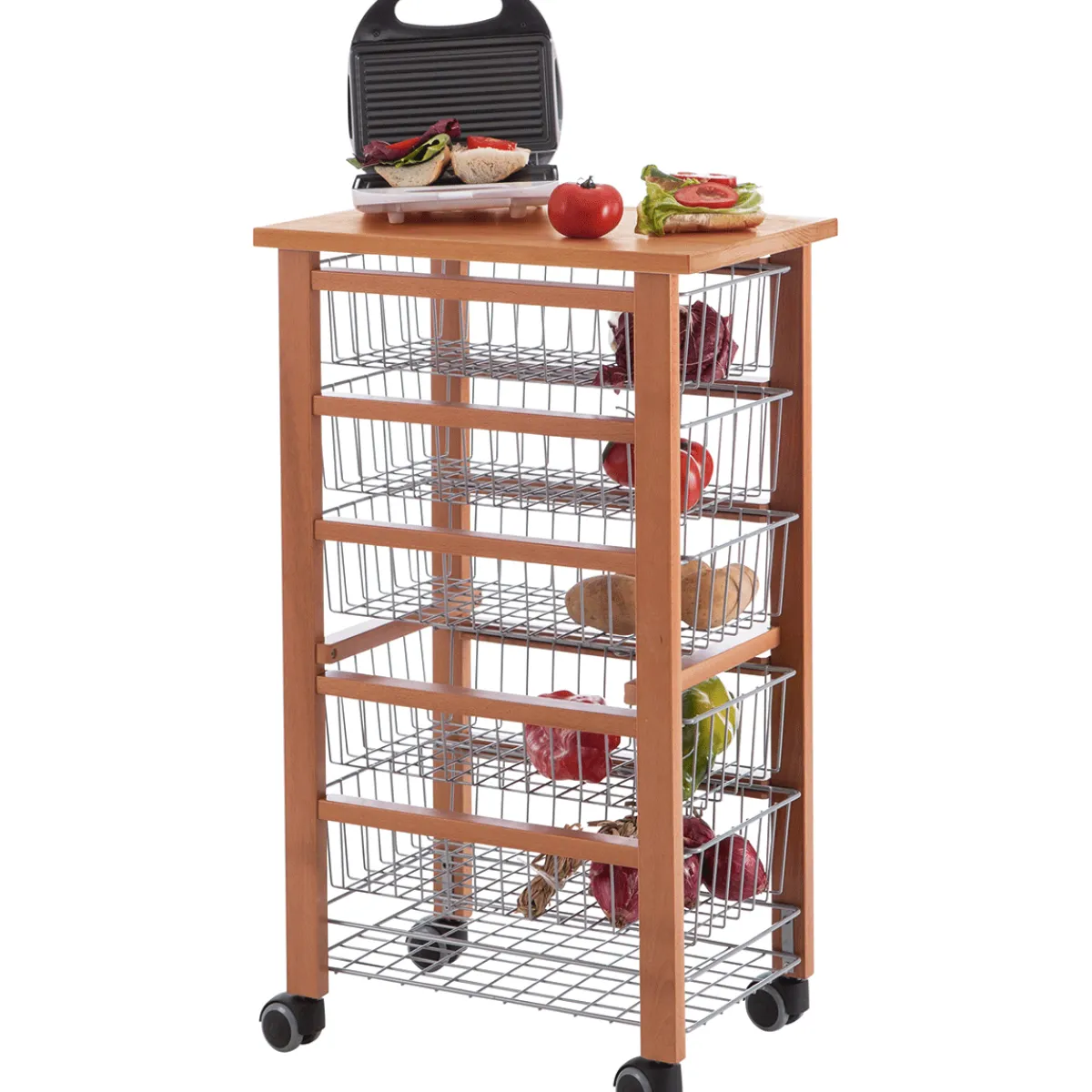 In diesem praktischen Küchenwagen aus schönem Buchenholz lassen sich Lebensmittel und andere nützliche Dinge lagern. In der Küche oder Speisekammer platziert, steht Ihnen mit dem fahrbaren Wagen ein flexibles und dekoratives Möbelstück zur Verfügung. Der Rollwagen aus massivem Buchenholz beherbergt sechs pulverbeschichtete Metallkörbe, von denen einer fest (ganz unten) und fünf ausziehbar sind. Die obere Ebene besteht aus einer edlen Spanplatte, die als Ablagefläche genutzt werden kann. Der Wagen lässt sich, dank der Räder aus spurlosem Gummi, leicht von A nach B bewegen. Hergestellt in Italien. Das Produkt wird zusammengebaut geliefert.