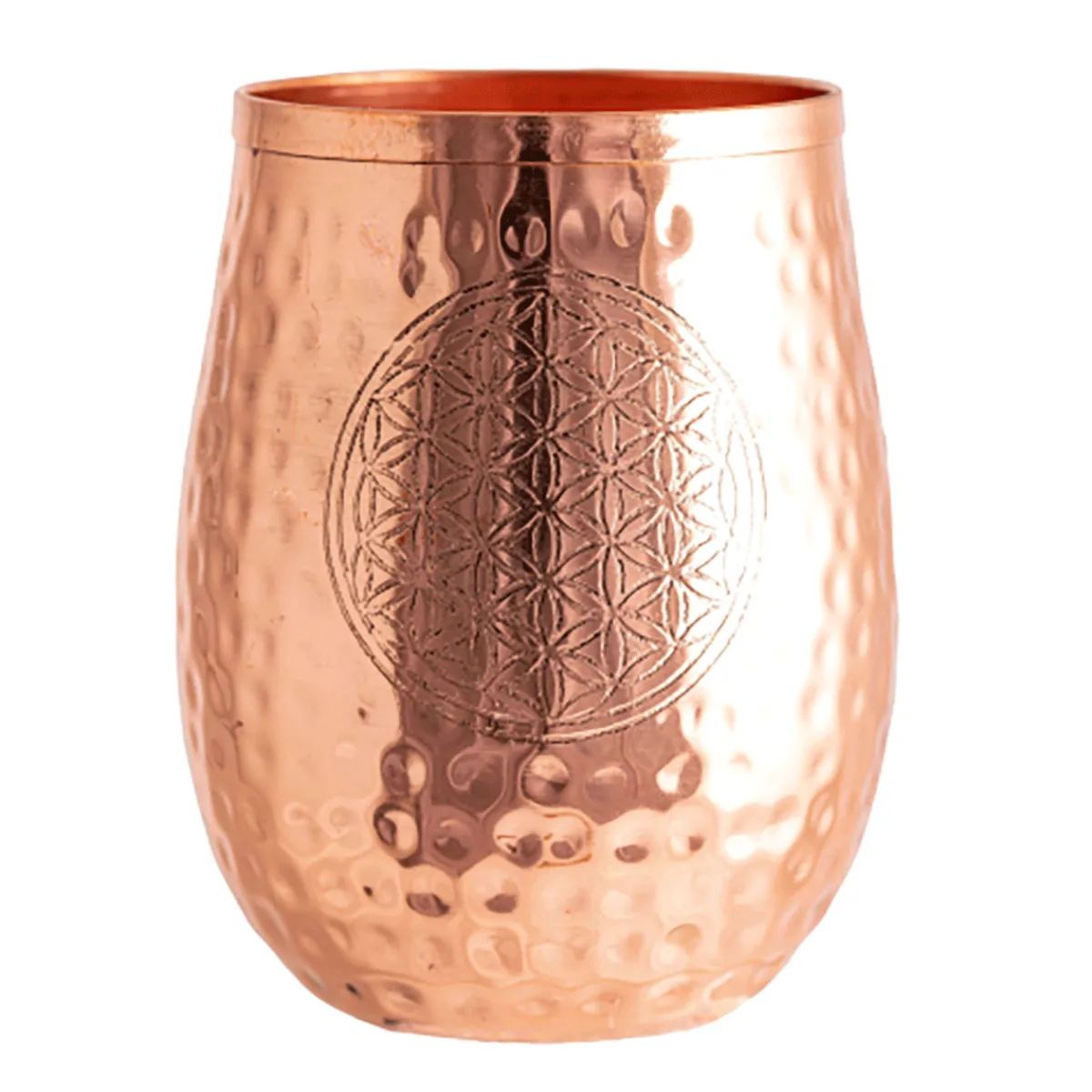 Die Kombination eines Kupfertrinkbechers mit dem Symbol der Blume des Lebens verbindet die gesundheitlichen Vorteile von Kupfer mit der tiefen symbolischen Bedeutung der Blume des Lebens. Wasser nimmt leicht Schwingungen auf. So können wir die Vorteile des Kupfers mit den Schwingungen des Schutzes und der spirituellen Harmonie kombinieren.Kupfer, Volumen: 450 ml, Ø ca. 8,5 cm, Standfläche Ø ca. 5 cm.Hinweis: Nicht spülmaschinengeeignet. Kohlensäure kann zu Reaktion mit Kupfer führen. Bitte nur mir stillem Wasser füllen.
