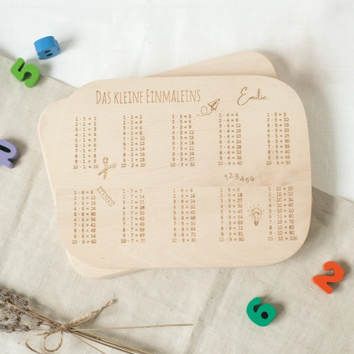 Wie wäre es, wenn Ihr Kind schon beim Frühstück ganz nebenbei Mathe lernen würde? Mit diesem Lernbrettchen funktioniert es tatsächlich. Das innovative Frühstücksbrettchen aus Buchenholz macht schon beim Frühstück Lust auf Lernen. Das Kleine Einmaleins ist während der gesamten Grundschulzeit ein Dauerbrenner, der immer wieder geübt werden muss. Da ist es doch toll, wenn das Lernen so ganz nebenbei und spielerisch erfolgt: bei einer Mahlzeit mit Lerneffekt.