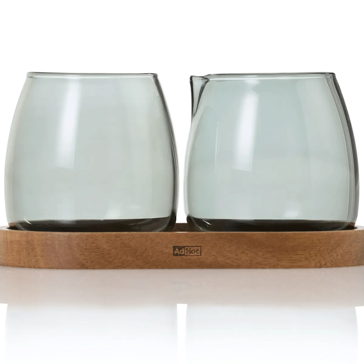 Servieren Sie die Beigaben für die Tee- oder Kaffeerunde skandinavisch schlicht mit dem Set aus grauem Borosilikatglas. Das kleine Kännchen fasst 230 ml Milch oder Sahne und das bauchige Zuckerglas bietet Platz für ca. 80 Gramm Süßes. Vereint stehen die beiden stilvollen Glasbehälter auf einem kleinen ovalen Tablett aus Akazienholz.