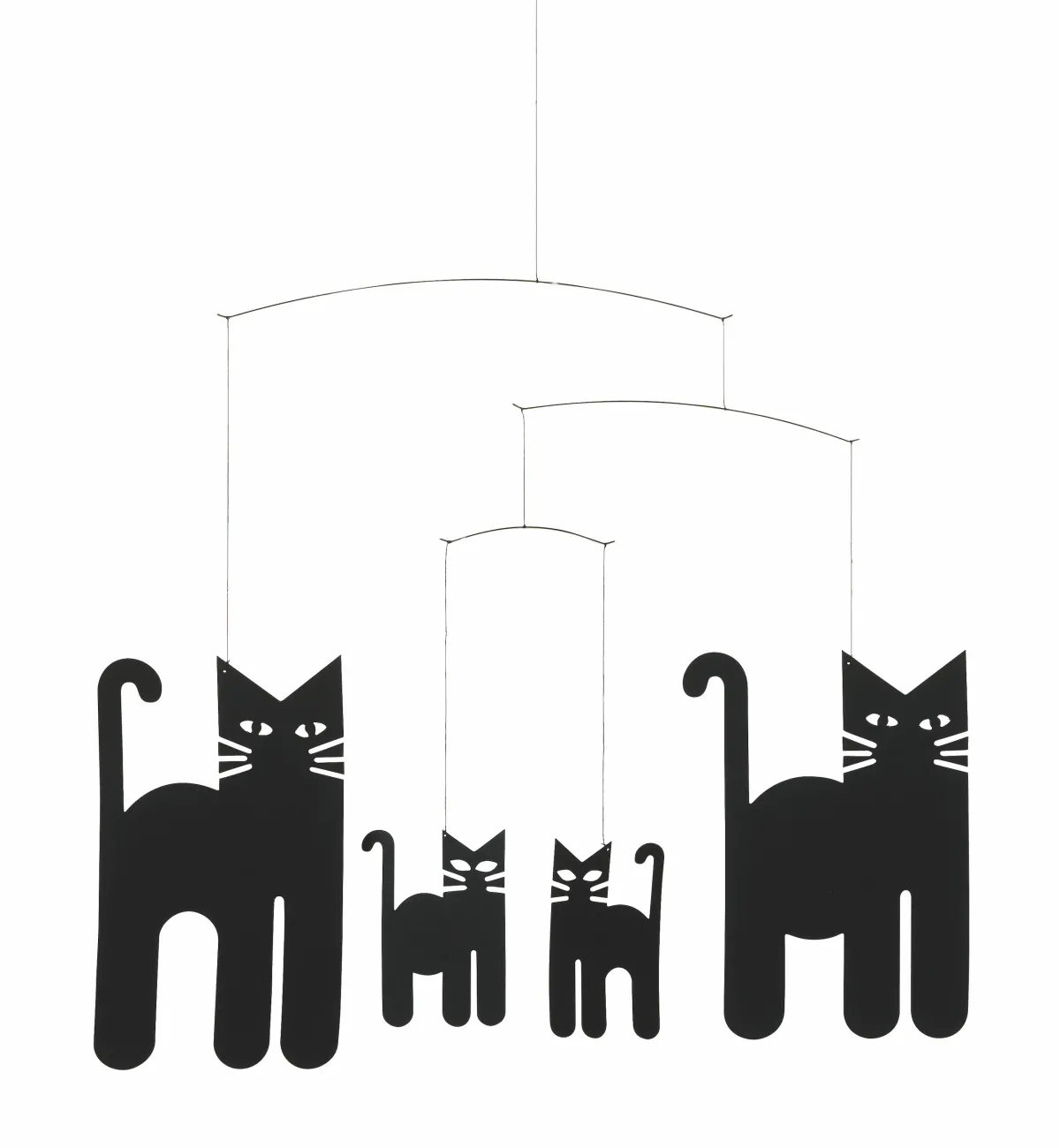 Ein Mobile, das die Herzen von Katzenliebhabern höherschlagen lässt! Die vier Mitglieder einer kleinen Katzenfamilie schleichen anmutig umeinander herum und ihre faszinierenden Gestalten kommen in den lebhaften Bewegungen schön zum Ausdruck. Wird er behutsam beleuchtet, vergrößert sich der tierische Zusammenschluss und ein ganzer Katzenclan bewegt sich über die Wände. Ole Flensted ist Teil des Familienunternehmens, das Christian Flensted 1965 ins Leben rief und teilt dessen Berufung zur Herstellung kunstvoller Mobiles, die heute auf der ganzen Welt schweben. Sie werden so kreiert, dass das gesamte Mobile ein harmonisches Gleichgewicht beibehält, während die einzelnen Elemente in ständiger Bewegung sind. Jedes Exemplar wird mit großer Sorgfalt hergestellt und verpackt, sodass es an seinem Zielort Poesie und Atmosphäre verbreitet.