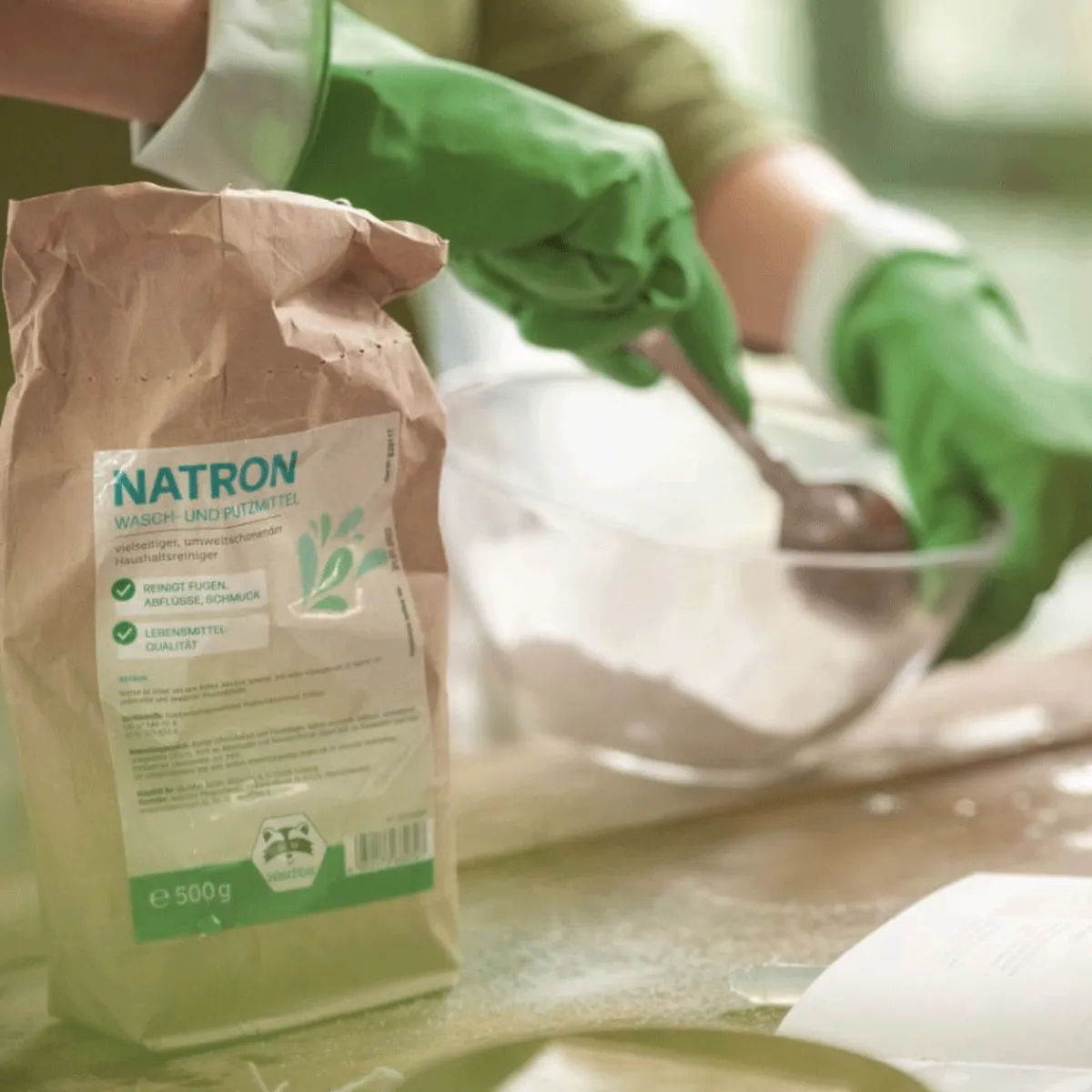 Nicht nur unsere Großmütter schätzten es, Natron war schon im frühen Altertum bewährtes Hausmittel. Heute ist es fast in Vergessenheit geraten, dabei macht sich Natron nahezu in jedem Haushaltsbereich nützlich – auf natürliche Art: Als Universalreiniger, Waschmittel, Weichspüler, Fleckentferner und Scheuerpulver. Es ist als Fettlöser, Wasserenthärter sowie als Geruchsentferner sehr wirksam. Man kann Natron pur oder als Basis für eigene Mischungen verwenden. Anwendungsbeispiele: Als Backofenreiniger reicht eine Natron-Wasser-Mischung im Verhältnis 1 zu 1, die auf die verkrusteten Stellen aufgetragen wird und über Nacht einwirkt. Danach lässt sich der Schmutz leicht entfernen, mit klarem Wasser nachwischen. Für eine Scheuerpaste 1 Glas Natron mit Wasser zu einer cremigen Paste verrühren. Danach Fliesen, Fugen, Porzellan, Edelstahl oder Silber reinigen, mit Wasser abspülen und nach Belieben trocken polieren. Als Etikettenlöser wird Natron mit der gleichen Menge Pflanzenöl vermischt. Diesen Brei dünn auf das Etikett auftragen und 20 bis 30 Minuten einwirken lassen. Etikett ablösen und Reste abwaschen. Beläge von Tee und Kaffee in Porzellan, Isolier- oder Trinkflaschen lassen sich leicht entfernen, indem man ca. 2 TL Natron in das Gefäß gibt und mit warmen, besser noch mit kochendem Wasser aufgießt. Einfach einige Stunden oder über Nacht einwirken lassen und ausspülen.