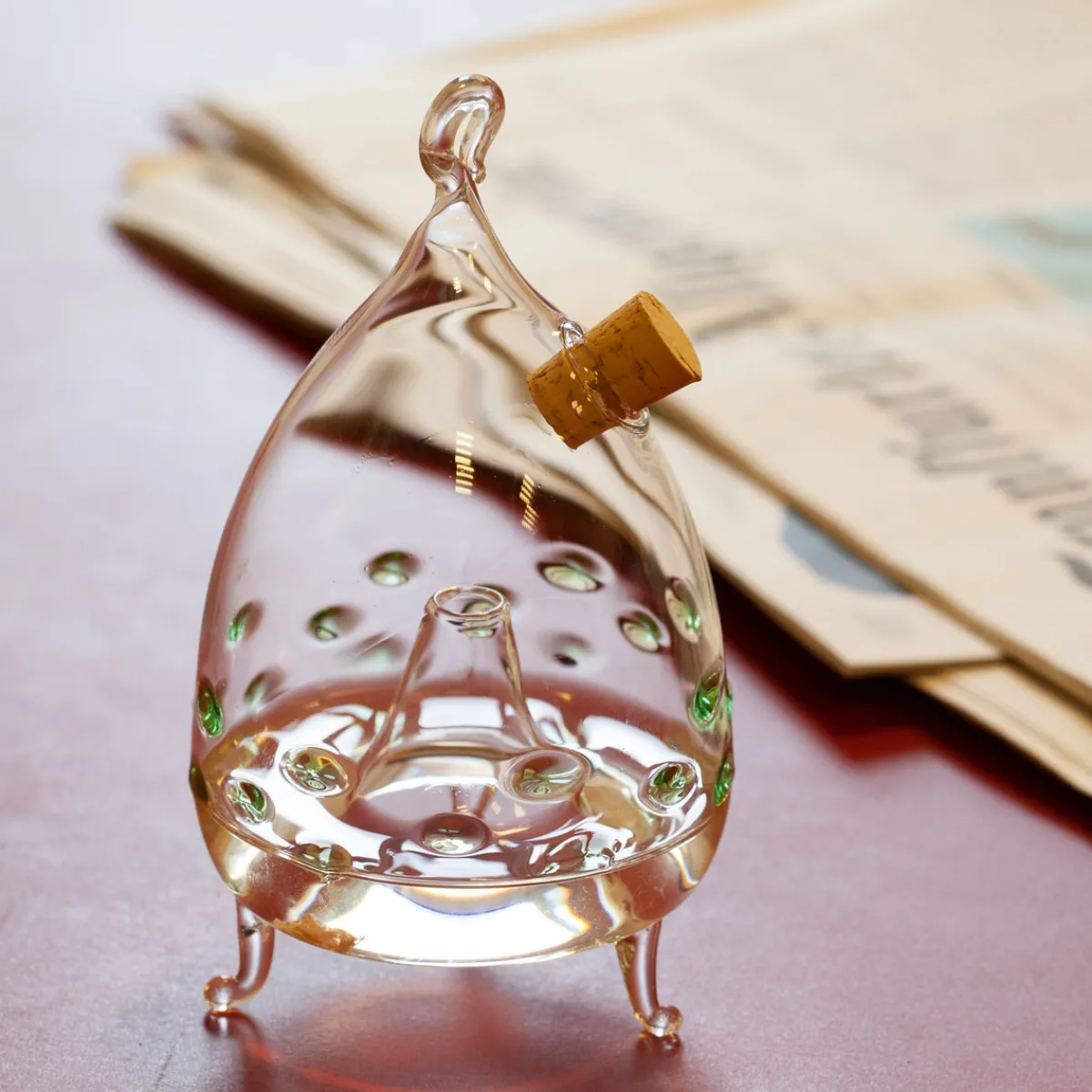In der schönen Frühlings- und Sommerfarbe Grün ist diese Obstfliegenfalle aus Glas dekoriert! In Massen auftretende Obstfliegen stellen eine wahre Plage in der Küche dar, nicht wahr? Mit dieser Falle aber werden Sie der Lage Herr. Die klassische Falle lockt Obst- und Fruchtfliegen und sogar Wespen zuverlässig an. Die gläserne Obstfliegenfalle fertigen versierte Glasbläser im thüringischen Lauscha in reiner Handarbeit: Das Gefäß wird mundgeblasen und handgeformt. Hier folgen erste, ganz einfache Gebrauchshinweise: Mischen Sie Zuckerwasser und etwas Apfelessig und befüllen Sie die Falle damit durch die Öffnung unter dem Korken. Verschließen Sie die Öffnung wieder gut und stellen oder hängen die Falle am Platz Ihrer Wahl auf. Die Insekten werden durch die Mixtur im Inneren angelockt und fliegen oder kriechen durch die Öffnung im Boden hinein. Spülen Sie die Falle regelmäßig aus und befüllen Sie sie neu.