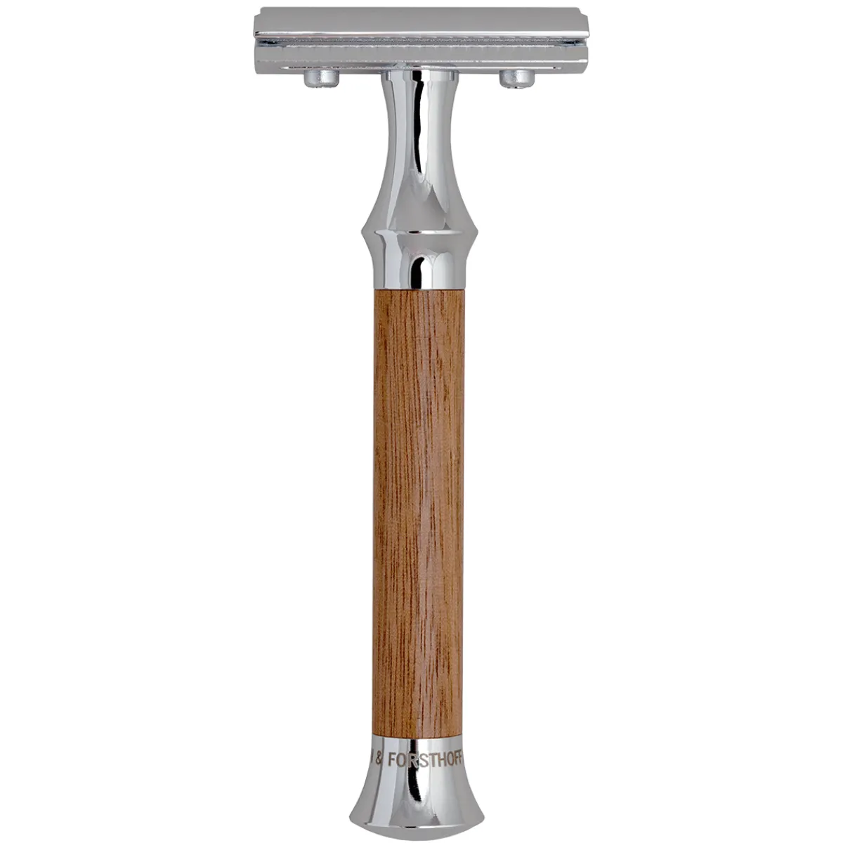 3-teiliger Rasierhobel, 10 cm, Griff verchromtes Messing mit Zwischenstück aus Eichenholz, inkl. 10 Rasierklingen.