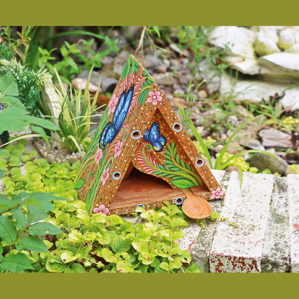 Mit diesem wunderschönen Schmetterlings- und Insektenhaus bringen Sie viele kleine Farbtupfer in Ihren Garten, denn es wird in fairer Produktion auf Bali aus nachhaltigem Holz handgefertigt und von versierten Kunsthandwerkern mit traditioneller Punktmalerei verziert. Das Häuschen bietet Nisthöhlen für Solitärbienen und einen versteckten Überwinterungsplatz für Schmetterlinge und andere nützliche Insekten wie Marienkäfer und Florfliegen. Der mitgelieferte abnehmbare Futterlöffel kann mit Schmetterlingsfutter, Zuckerwasser oder Obst gefüllt werden, um die Besucher Ihres Gartens anzulocken und zu ernähren. Das ist besonders effektiv im Frühjahr und Spätsommer, wenn der natürliche Nektar knapp ist. Stellen Sie das Schmetterlingshaus an einem sonnigen, möglichst windgeschützten Ort auf. Dazu können Sie den Aufhängehaken an der Rückseite verwenden. Waschen Sie den Nektarlöffel regelmäßig mit klarem Wasser ab, um Bakterienbildung zu vermeiden.