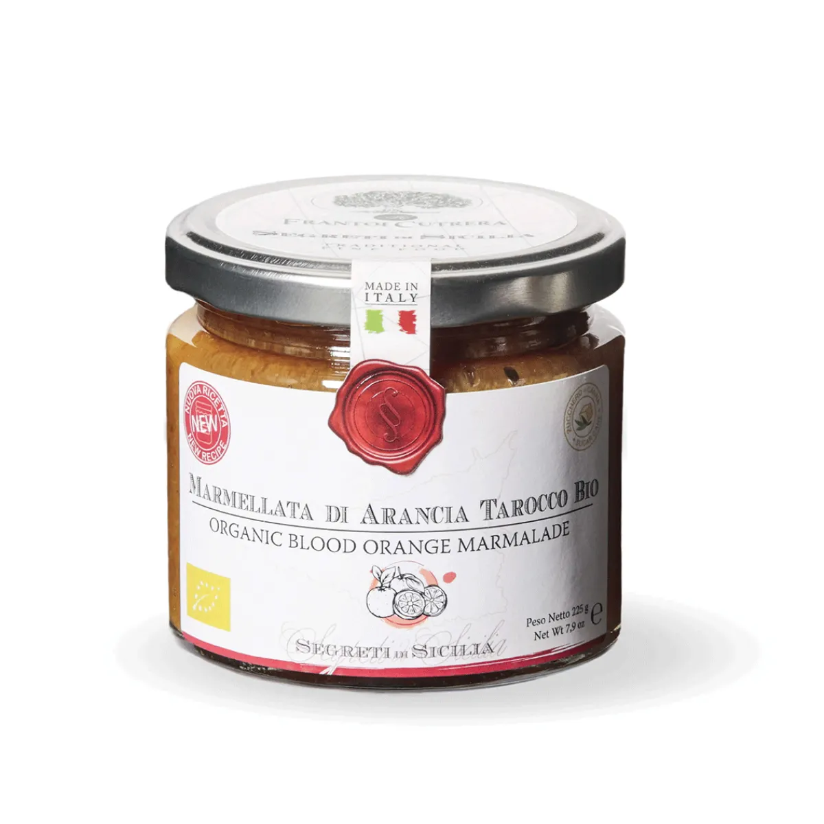 Die Sonne Siziliens im Glas: Für die »Marmellata di Arancia Tarocco Bio« werden ausschließlich Tarocco-Blutorangen aus der Ebene von Catania verarbeitet. Die erntefrischen Früchte werden schonend mit biologisch angebautem Rohrzucker und Zitronensaft eingekocht, um das intensive Aroma, die feine Süße und die charakteristische Bitterkeit perfekt herauszuarbeiten. Ideal zum Frühstück, köstlich zu Käse oder zum Verfeinern von Kuchen und Desserts. (bio-zert. IT-Bio-008)